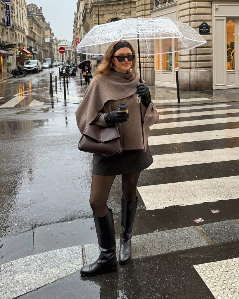 This outfit is what “cozy-chic” is all about, and it’s specifically perfect for rainy weather. The taupe-colored cape is stunning and hugs your body in all the right ways, with an edgy, retro vibe that’s perfect for those crisp early mornings and slow, wet walks through town. The black rain boots make all of these great inspo photos feel trendy, perfect, and totally cute in 2026.