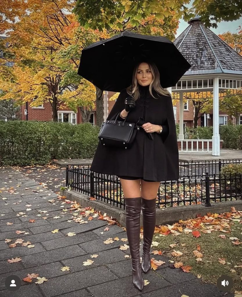 14. Dramatic All-Black Cape With Over-the-Knee Boots