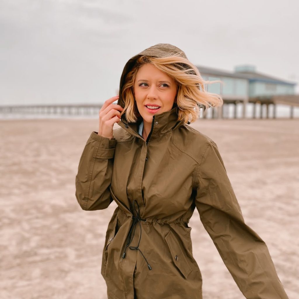 This outfit is so easy, relaxed, and great for those windy and rainy days at the beach. The olive hooded raincoat, in particular, has such a laid-back and very 2026 style—light, cute, and perfect for women who like clothes that are relaxed yet flattering at the same time.