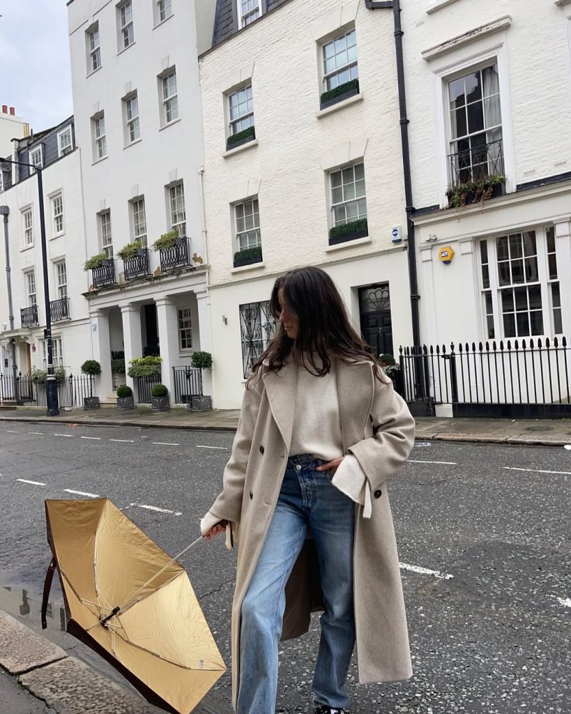 And if you are going to school or the office, as well as completing some errands, this outfit is really practical. The long coat will protect you from rain, and your neutral-colored clothes make it easy to mix and match, and all structured pieces add to your outfit’s sophistication. It is a wonderful motivational picture not only for rainy days but also for perfect wardrobe staples for all seasons and years.