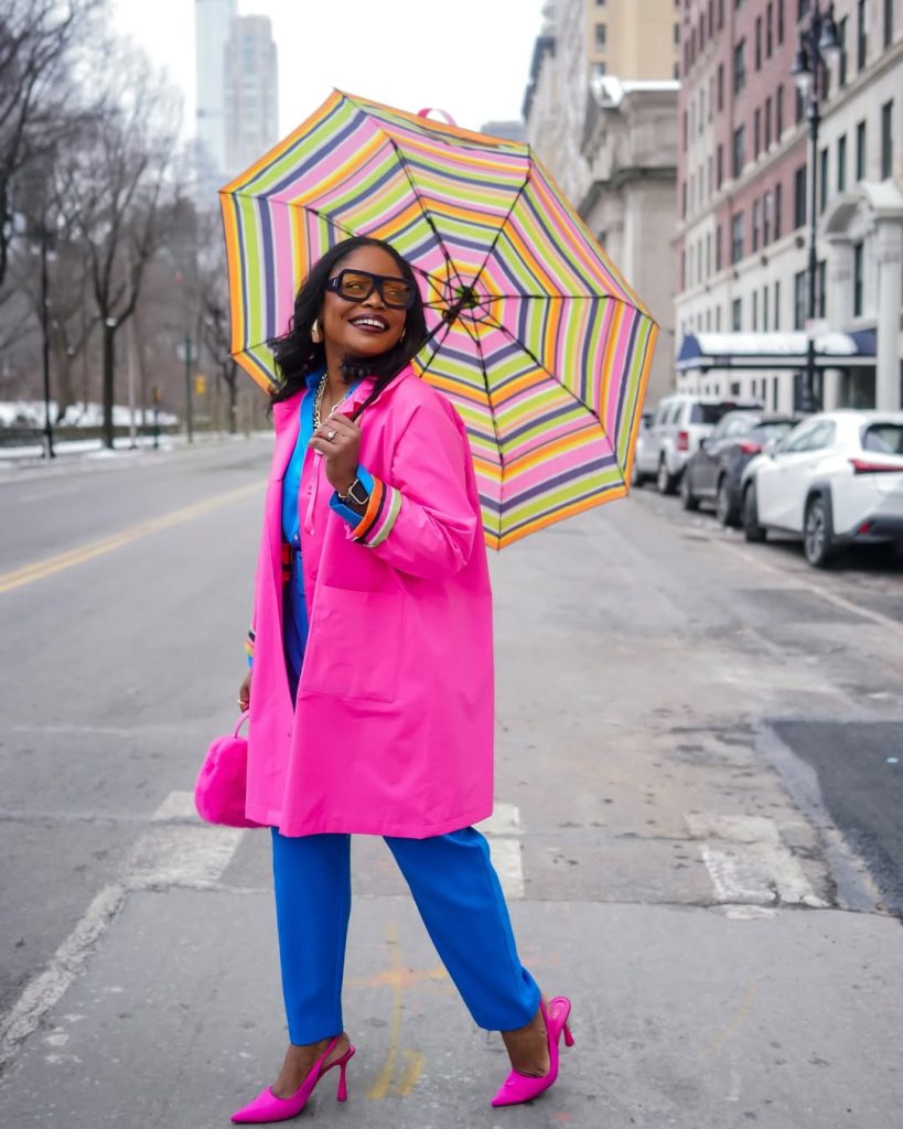 This outfit is pure happiness—bright, bold, and spreading sunshine on a rainy day. The pink raincoat with blue electric pants has got one smoking hot, trendy color-blocking statement that’s fun and elegant at the same time. It’s an adorable reminder that you can rock rainy fashion without making it plain, and it all exudes such new-energy vibes and new decades like 2026.
