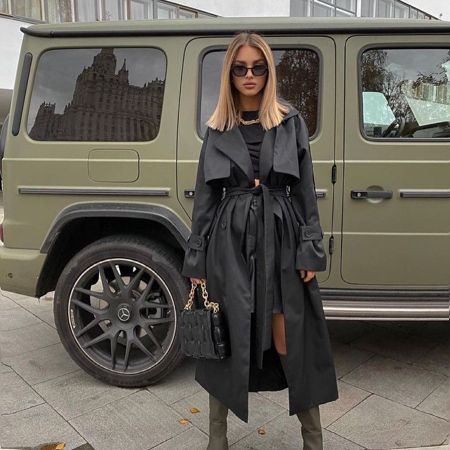 This is all about confidence in fashion! The outfit is composed of a long all-black trench coat, sunglasses, and monochromatic style, making it modern and cool. Such an outfit may make you walk along rainy-day streets like you are about to walk down an actual fashion runway. This stylish and glamorous outfit will be perfect for autumn and winter rainy days.