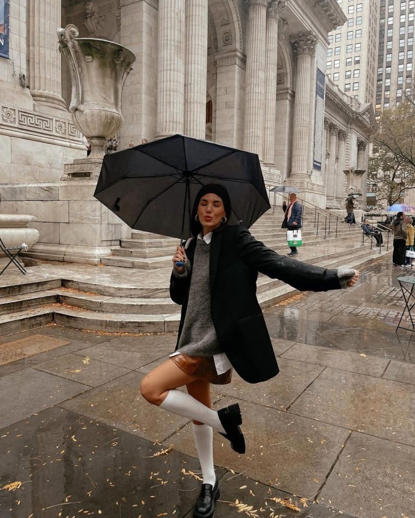 This outfit is such an awesome and fun combination of cute, elegant, and ever so sweet with a pinch of nostalgia glimmering in it. The sweater vest paired over a crisp shirt and paired with this school-inspired outfit is perfect and so trendy on those cold and rainy days. The blazer adds elegance with style, and paired with the mini and knee-high socks, this one’s one of those perfect inspos that make you want to dance under your umbrella in New York City!