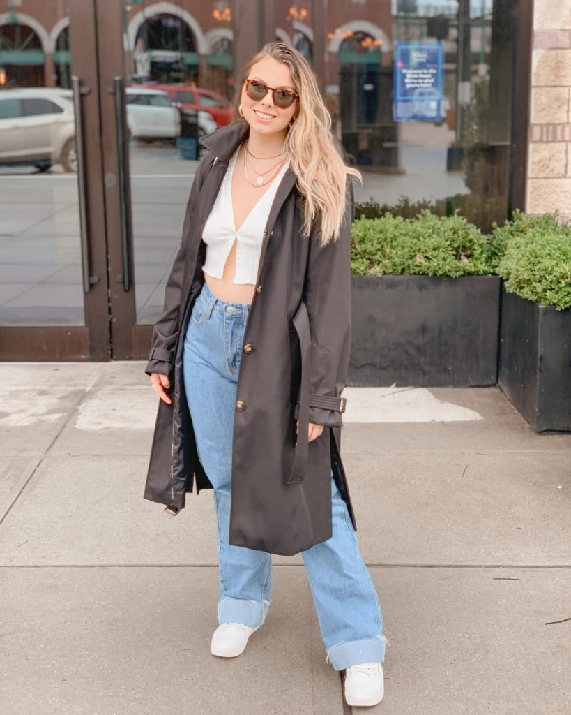 This outfit exudes that easy, relaxed, and comfy style, perfect and so inviting, especially when it rains. The long black trench coat offers an elegant and classy style, with light denim and white crop tops providing an easy and cute outfit perfect for those balmy showers and various summer rainouts when you can still be trendy without overdoing anything.