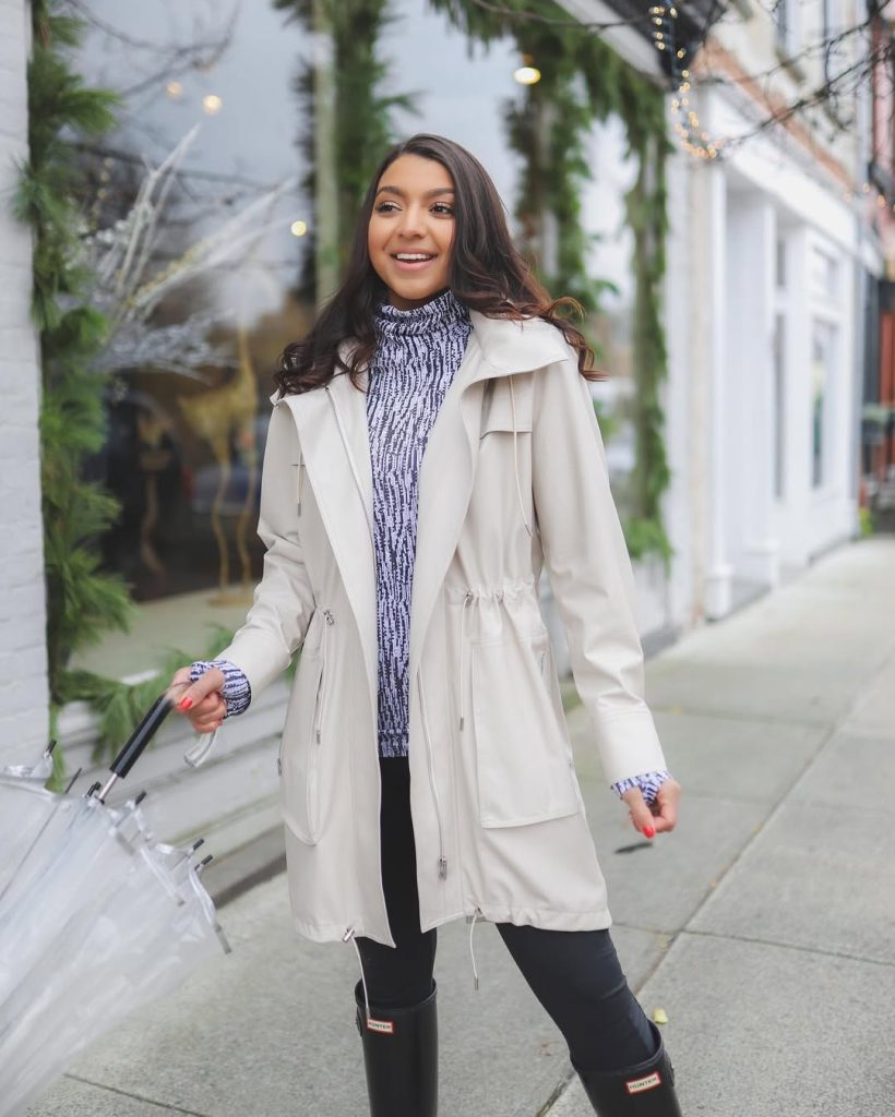 This outfit has all that effortlessly stylish, invitingly cozy, and totally chic-angled appeal that makes rainy day style suddenly and profoundly interesting. And with its neutral-colored, top-layer ivory knit, long ivory turtleneck, and tan-colored raincoat, this outfit has all such neutral tones that, when combined, make up not only an effortlessly stylish appeal but also one that’s really, really trendy and totally perfect in its fashion.