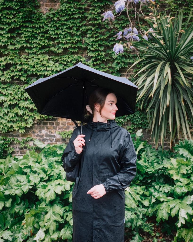 This all-black getup is one type of rain fashion that instantly exudes sophistication and power and is one of those rainy day outfit ideas that is perfect and elegant right from the get-go. The long coat, shine, and minimalist design provide one awesome and edgy NYC-style rainy-day look, and it’d be perfect if you need something with minimal effort that’s elegant without really compromising your comfort, especially if it’s quite cold and wet.