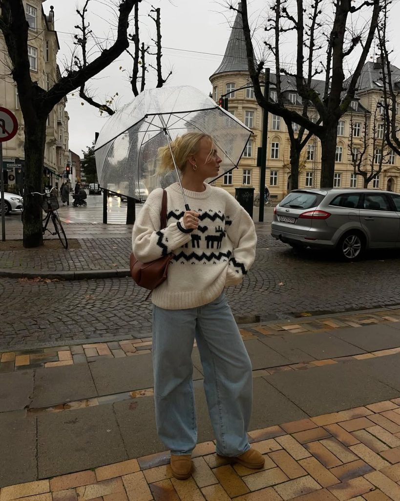 There is nothing quite like donning that giant, cozy sweater and rainy fall mornings, and this outfit is all about capturing that perfect vibe. The fun knit pattern contributes to its cute quotient, and the relaxed jeans with soft and warm hues make this entire outfit not only adorable but invitingly cozy and nostalgic, perfect as it is, even in the rain, to lounge around and take your sweet time, especially at slow, lazy weekends.