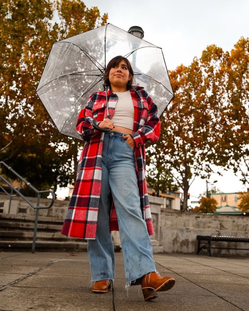 This outfit brings a burst of hot, cheerful color to an otherwise gray rainy day. The long red plaid coat instantly sets the tone—fun, cozy, and full of confidence. Paired with light denim and boots, it creates a casual aesthetic while still giving that trendy 2026 flair. It’s the perfect inspo for women who love something bold enough to brighten the weather but simple enough for everyday wear.
