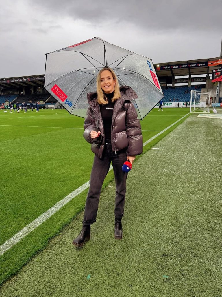There’s something instantly cozy about a shiny puffer on a rainy day—especially when paired with a clear umbrella and a sleek all-black base. This look gives off that cute but practical vibe, perfect for cold stadium mornings or casual work errands. The mix of textures keeps everything trendy while still feeling simple and wearable, and the whole outfit has that slightly sporty aesthetic that’s big for 2026.