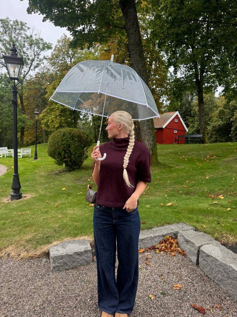 The dark burgundy knit sweater really offers such elegance and warmth to any rainy day. Team it with an umbrella and wide-leg jeans, and you get something so cozy rather than so bulky, ideal for either an evening walk in the park or a lazy weekend in fall. There’s something so adorable and so easy-going about this outfit, particularly with such subtle color combinations that seem right on point with 2026 fashion trends.
