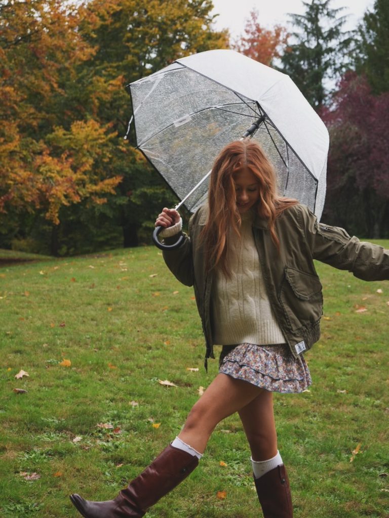 This playful mix of a soft knit sweater, mini skirt, and rugged jacket gives rainy days such a youthful, fun, and cute twist. The outfit brings a cozy aesthetic while still feeling light and breezy enough for those warmer fall showers. Paired with tall boots, it’s a flirty, comfy blend that instantly brightens up a gray afternoon.
