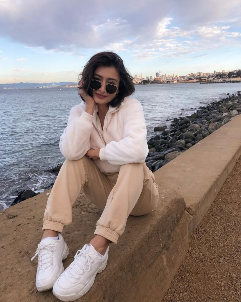 A relaxed, coastal-inspired athleisure look blends soft beige tones with plush textures, perfect for breezy mornings and lingering cold afternoons near the water.