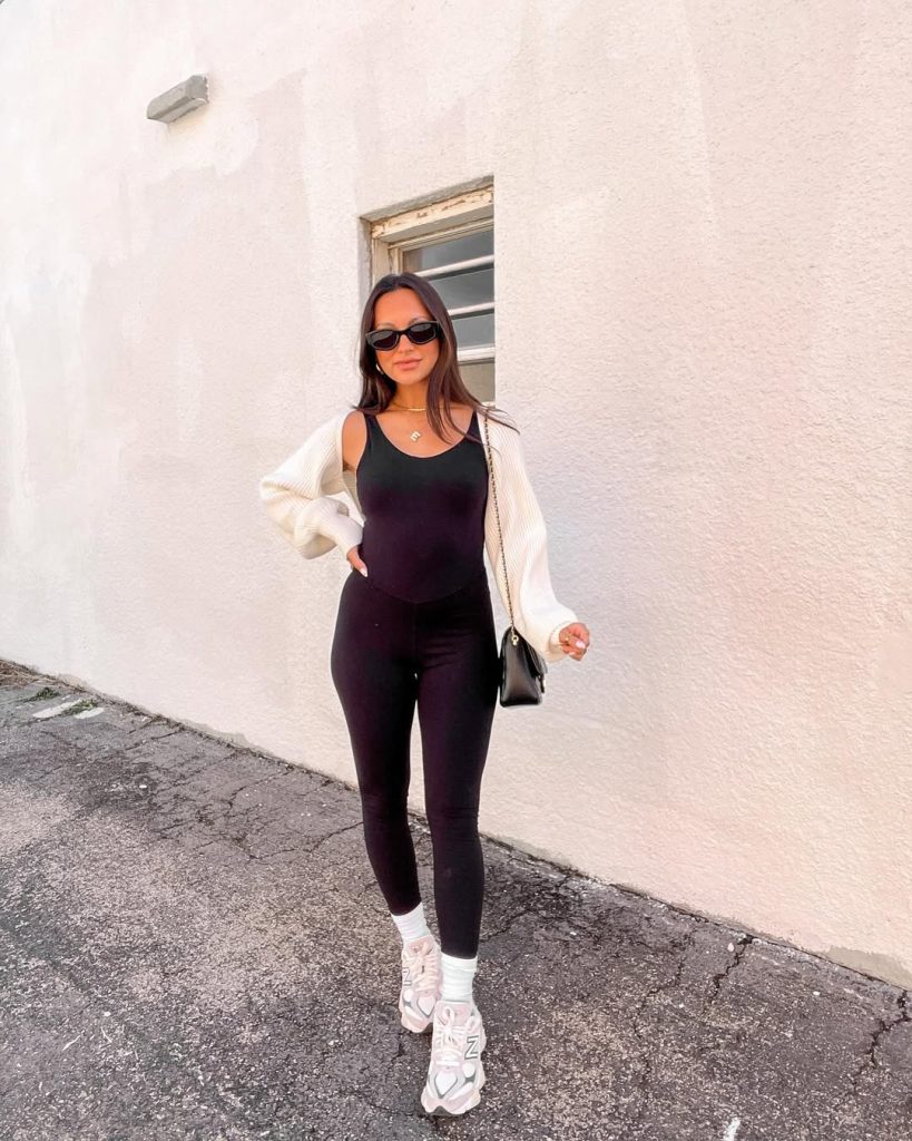 A sleek black base softened by a cozy knit layer creates an athleisure look that feels refined, feminine, and quietly confident.