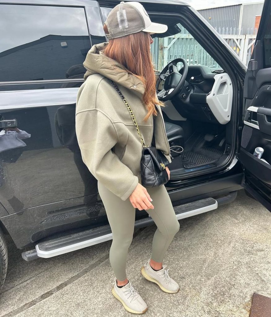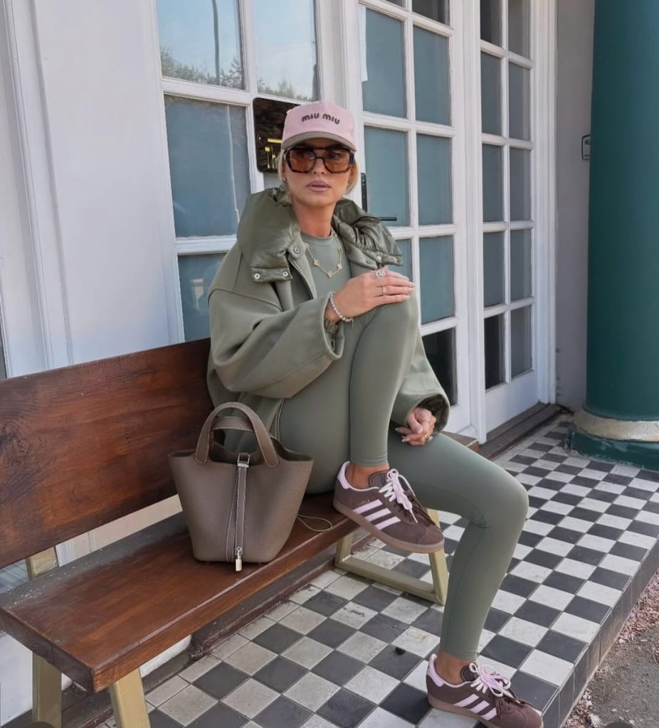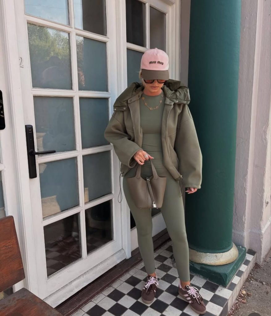 This olive-toned athleisure look leans into quiet luxury, blending sporty comfort with thoughtful, fashion-forward accents. It feels intentional, grounded, and incredibly wearable.