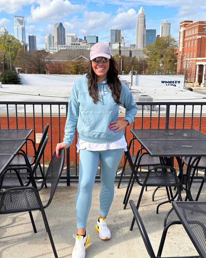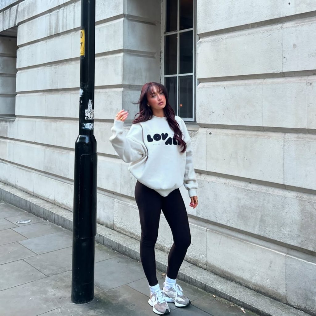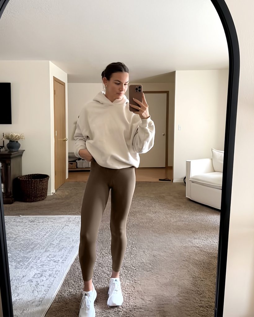 A relaxed sweatshirt paired with crisp leggings creates an effortless, lived-in athleisure look that feels comfortable yet intentional.