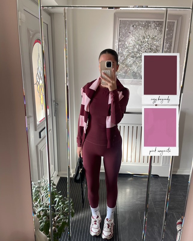 Rich burgundy tones take center stage in this coordinated athleisure look, elevated with soft contrast layering.