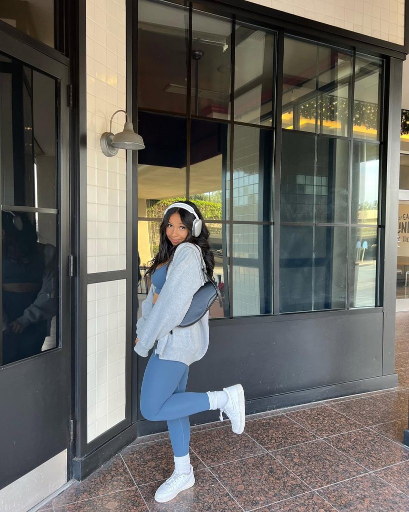 A calm, monochrome blue athleisure look delivers relaxed confidence, blending softness with structure for days that move at an easy pace.