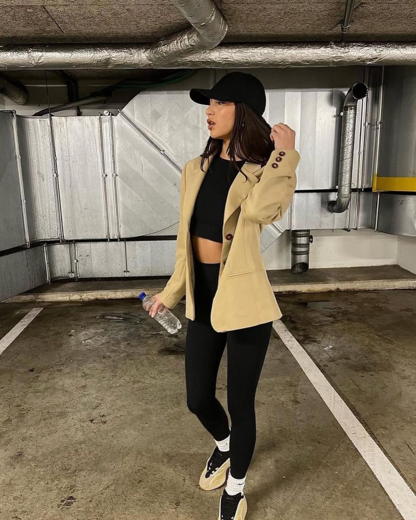 Sharp layering elevates classic black athleisure into a confident, city-ready ensemble that feels bold without trying too hard.