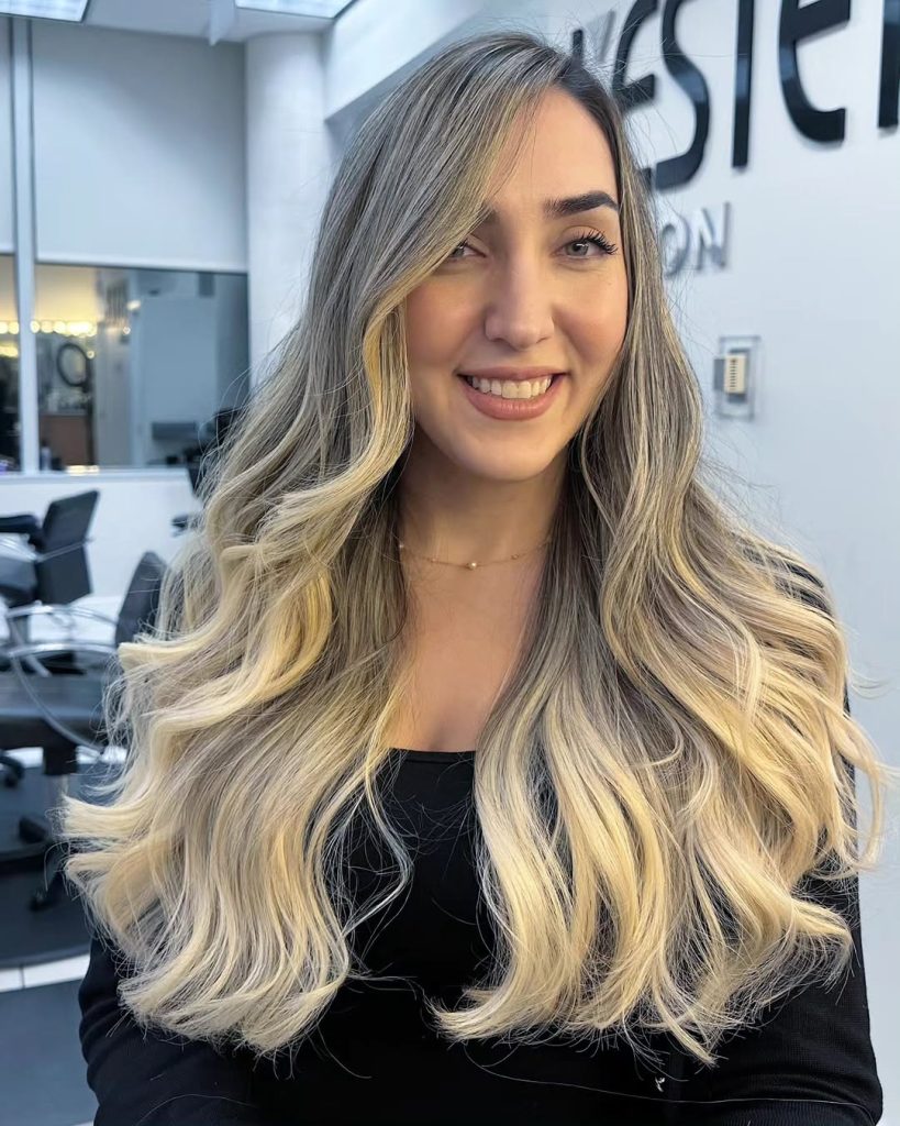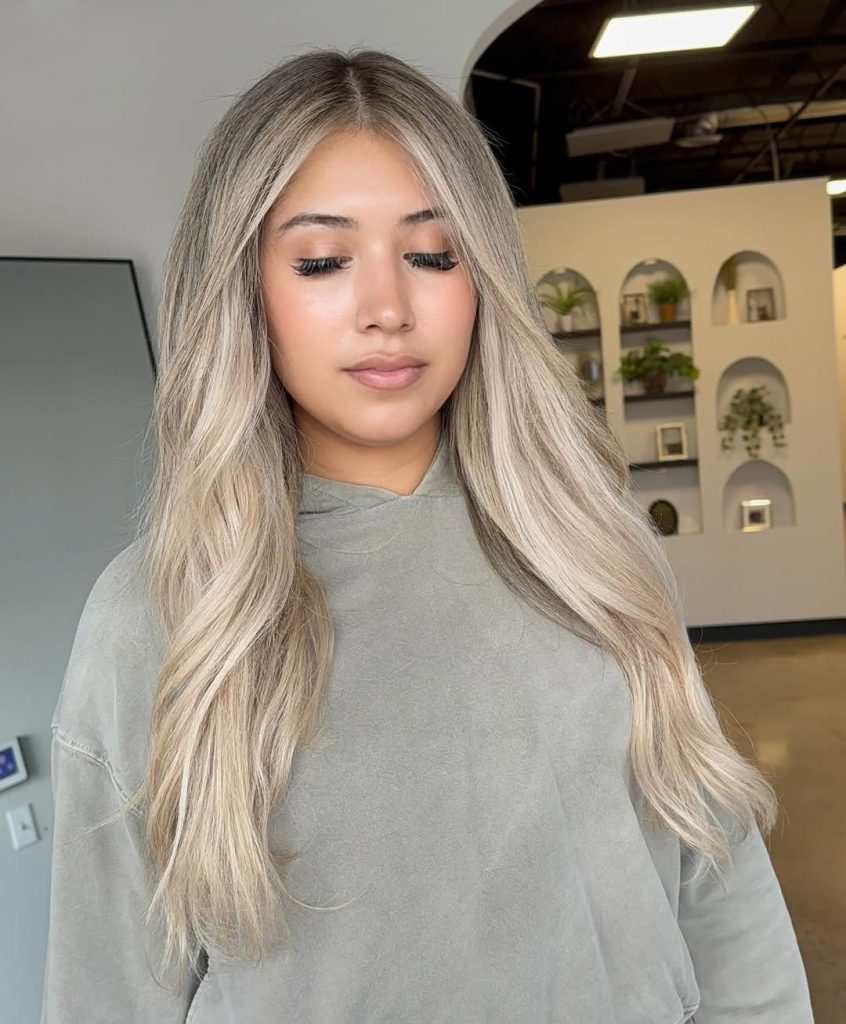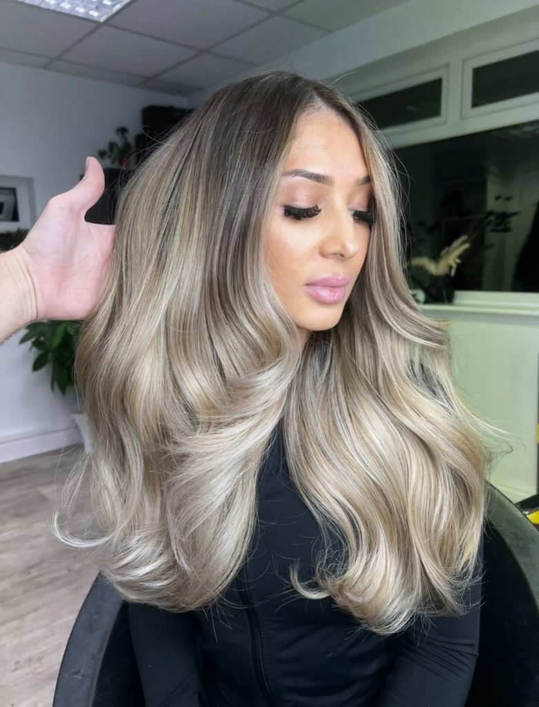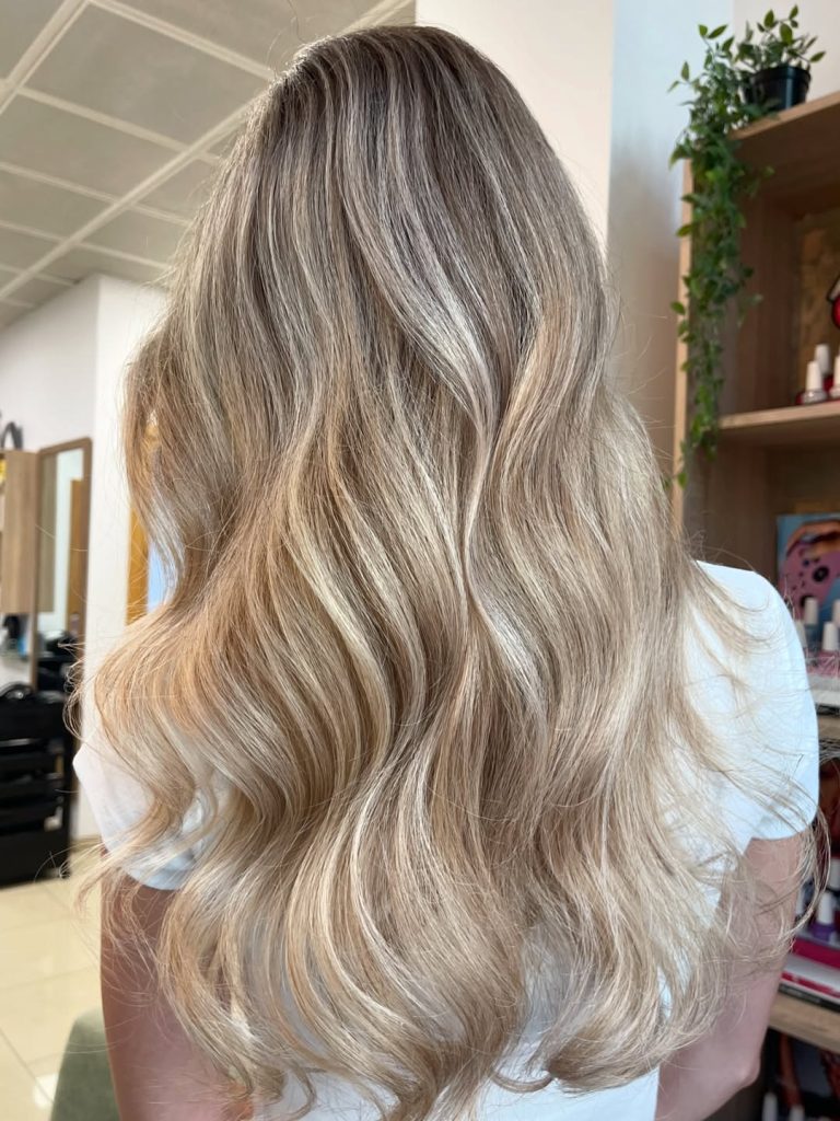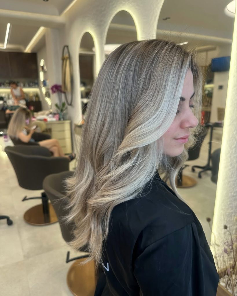 This Cool beige blonde feels incredibly refined, with a seamless blend that almost melts from root to tip. The delicate light strands are placed in such a way that they enhance the natural movement of the hair, creating a soft, fluid finish that looks effortless. It’s understated but undeniably elegant—perfect for someone who prefers quiet luxury over bold contrast.