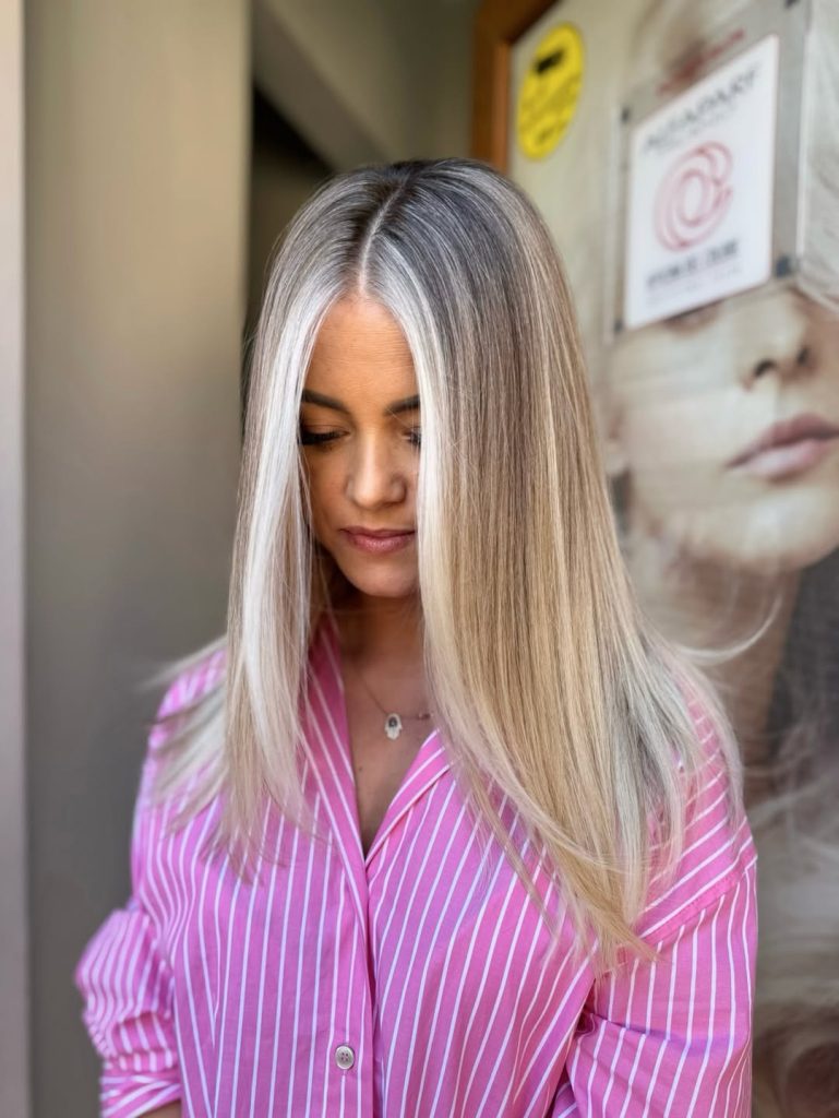 This style is perfect for Straight hair and women who love a clean, refined aesthetic. It works especially well for fine to medium Hair, as the smooth finish enhances shine and makes the color look even brighter. A heat protectant and flat iron will help maintain that glass-like effect, while toning products will preserve the Cool blonde Tone.