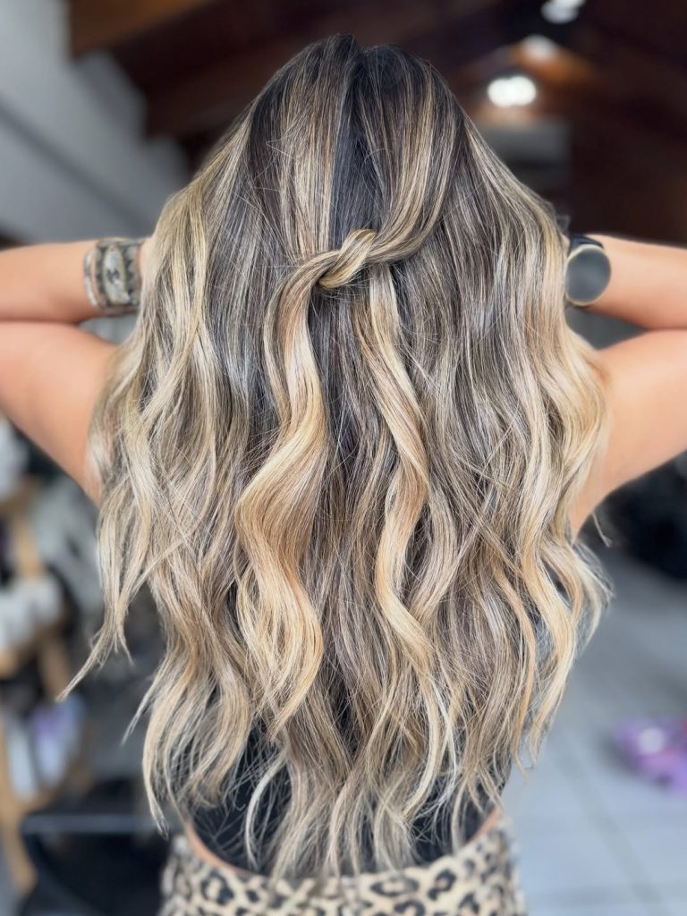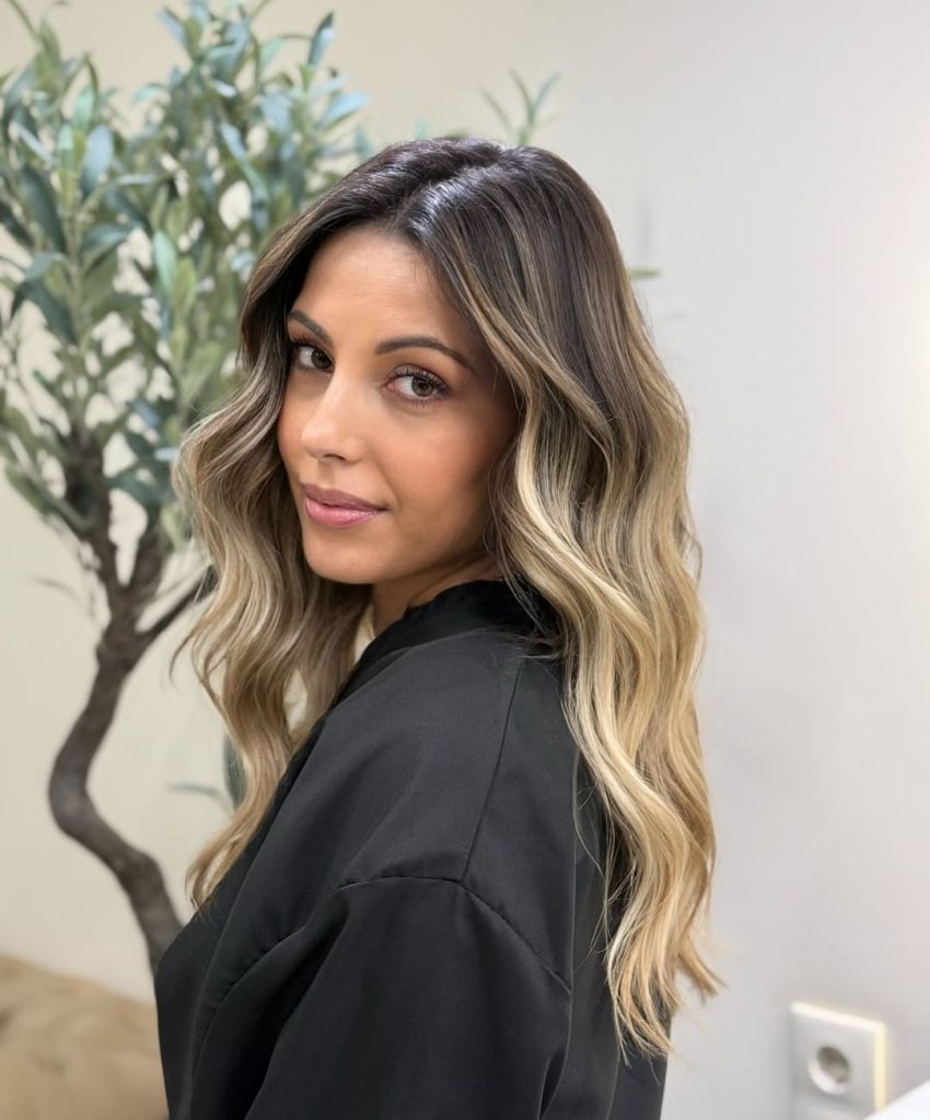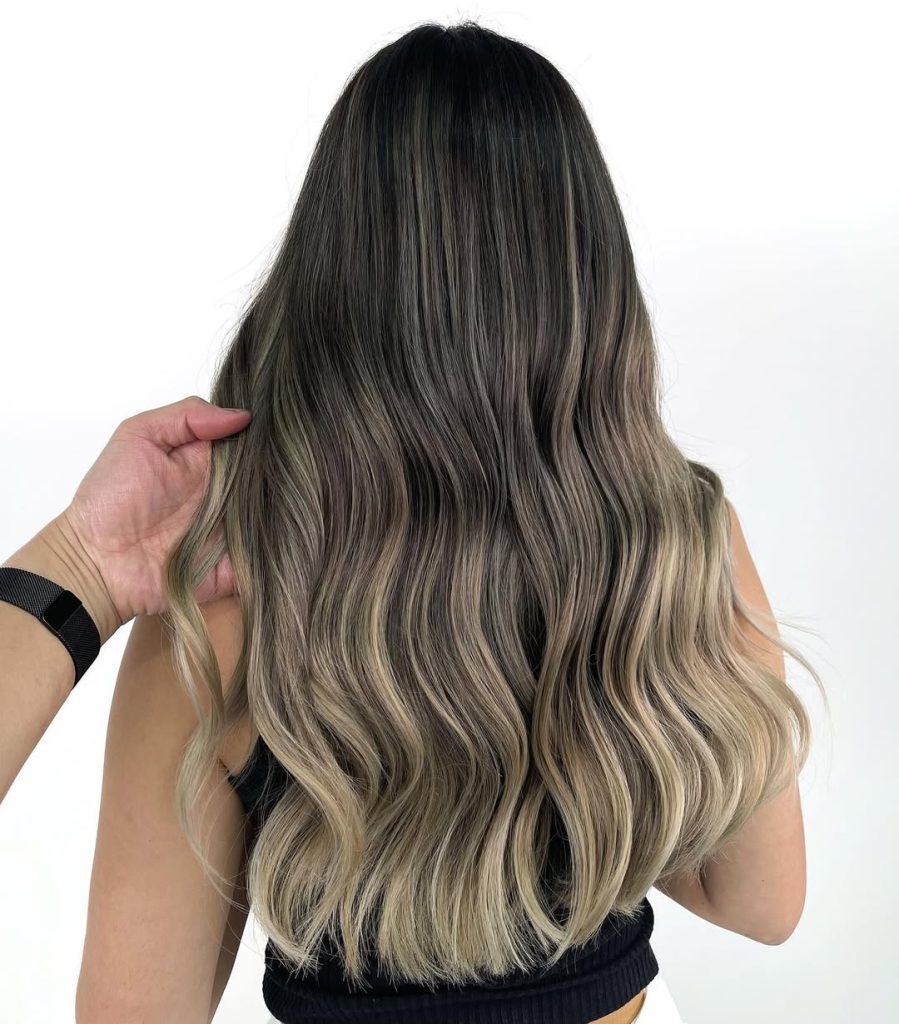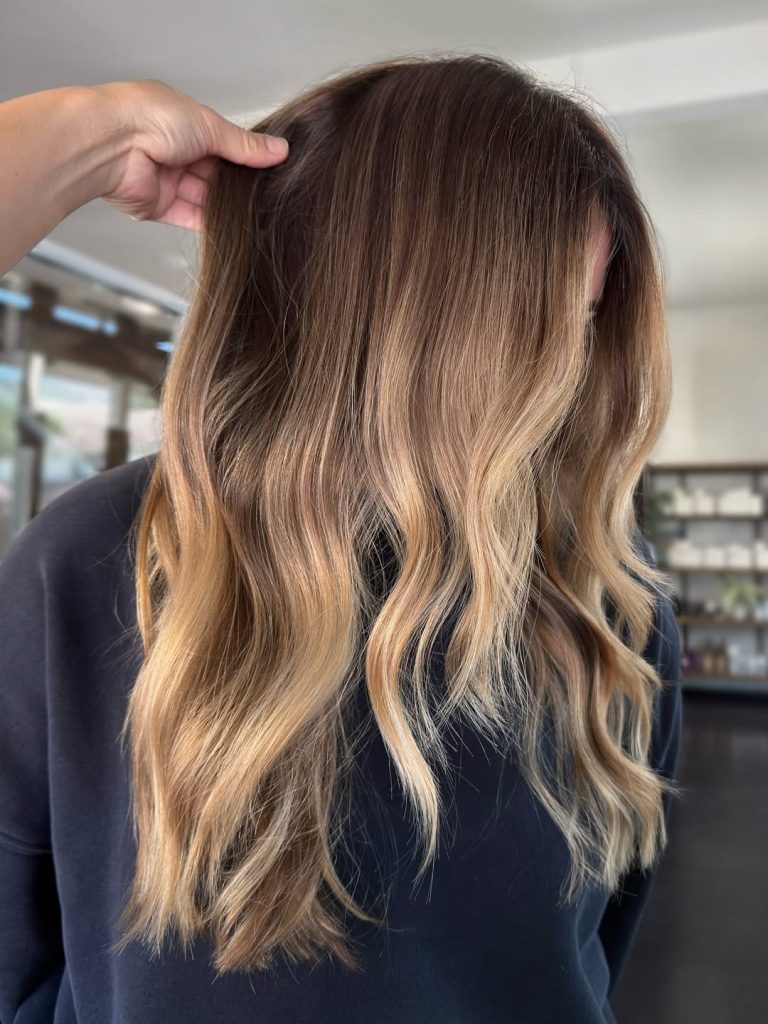 This balayage has that effortless, lived-in beauty that feels completely Natural and timeless. Starting with a deeper brown base, the color gradually transitions into warm blonde ends, creating a soft gradient that mimics how hair naturally lightens in the sun. The flow of the waves adds an organic, almost undone charm that feels relaxed yet still put together.