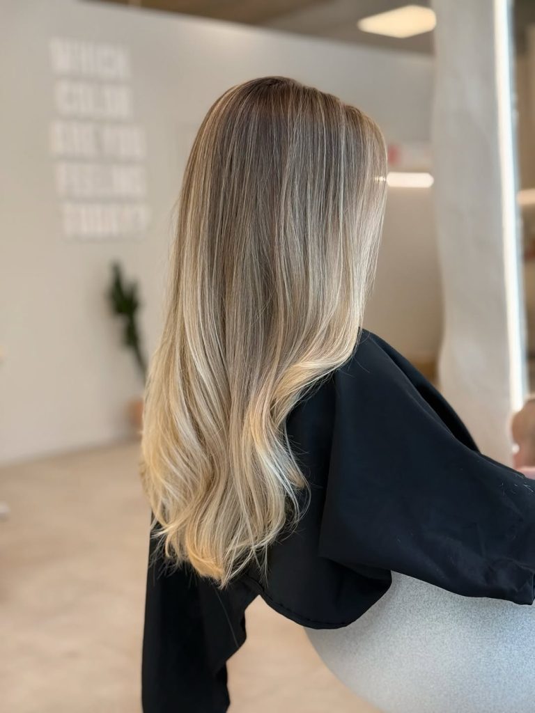 This Cool blonde balayage feels effortlessly modern, with a Soft blend that flows naturally from darker roots into lighter ends. The overall effect is Light, airy, and incredibly flattering, giving the Hair a fresh, lived-in feel. The gentle movement keeps it from looking too structured, making it perfect for everyday wear.