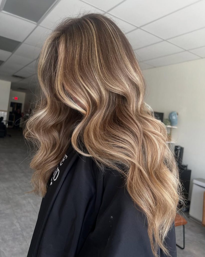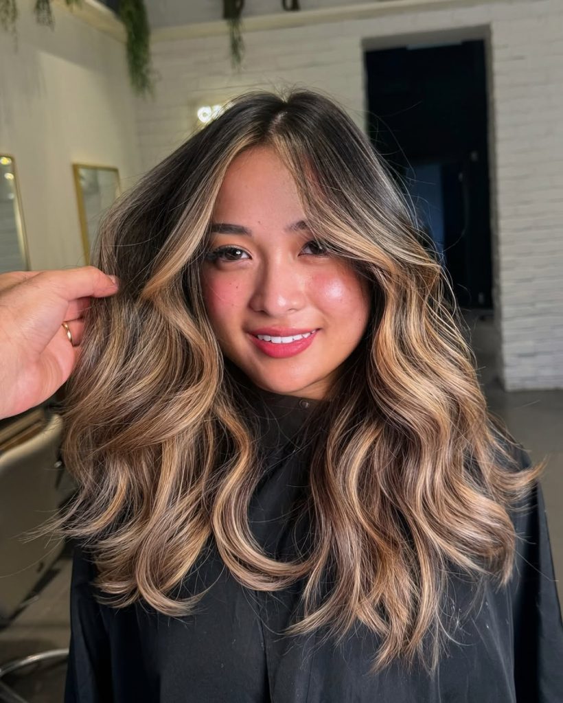 If you’ve been exploring Dark brown hair color ideas and honey variations, this style offers a lighter, more dimensional look. It’s especially flattering for those with Brown hair who are looking to brighten things up without going fully blonde. The waves enhance the depths and Layers, and a gloss treatment will keep the colors looking rich and luminous between appointments.