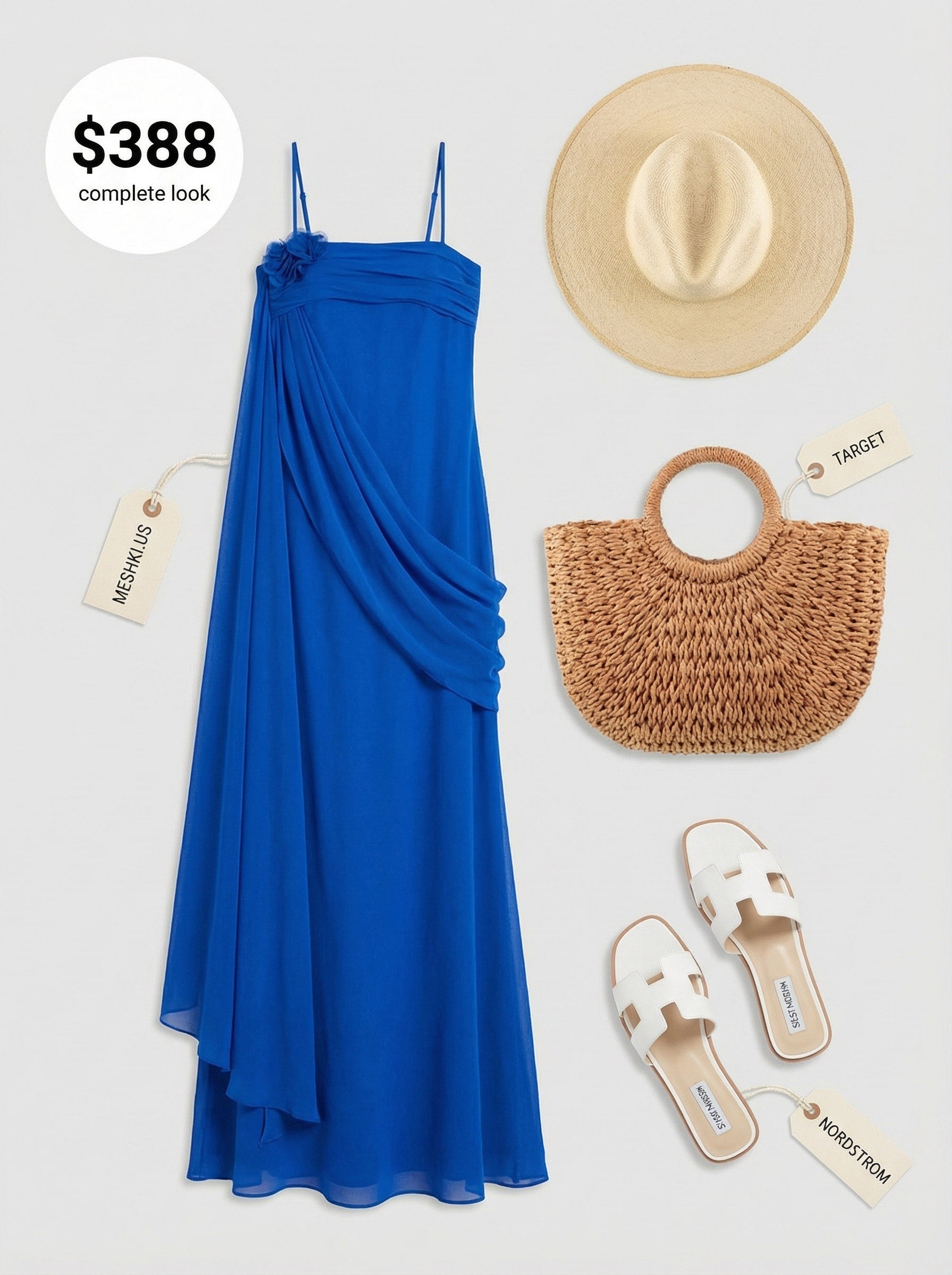 Ultimately, this ‘Resort Ready’ look with its vibrant Riviera Blue dress and gold accents is aspirational but also practical. It’s exactly the kind of ensemble I want for a vacation, combining comfort with a touch of elegance. Buy it once and stop thinking about it.
