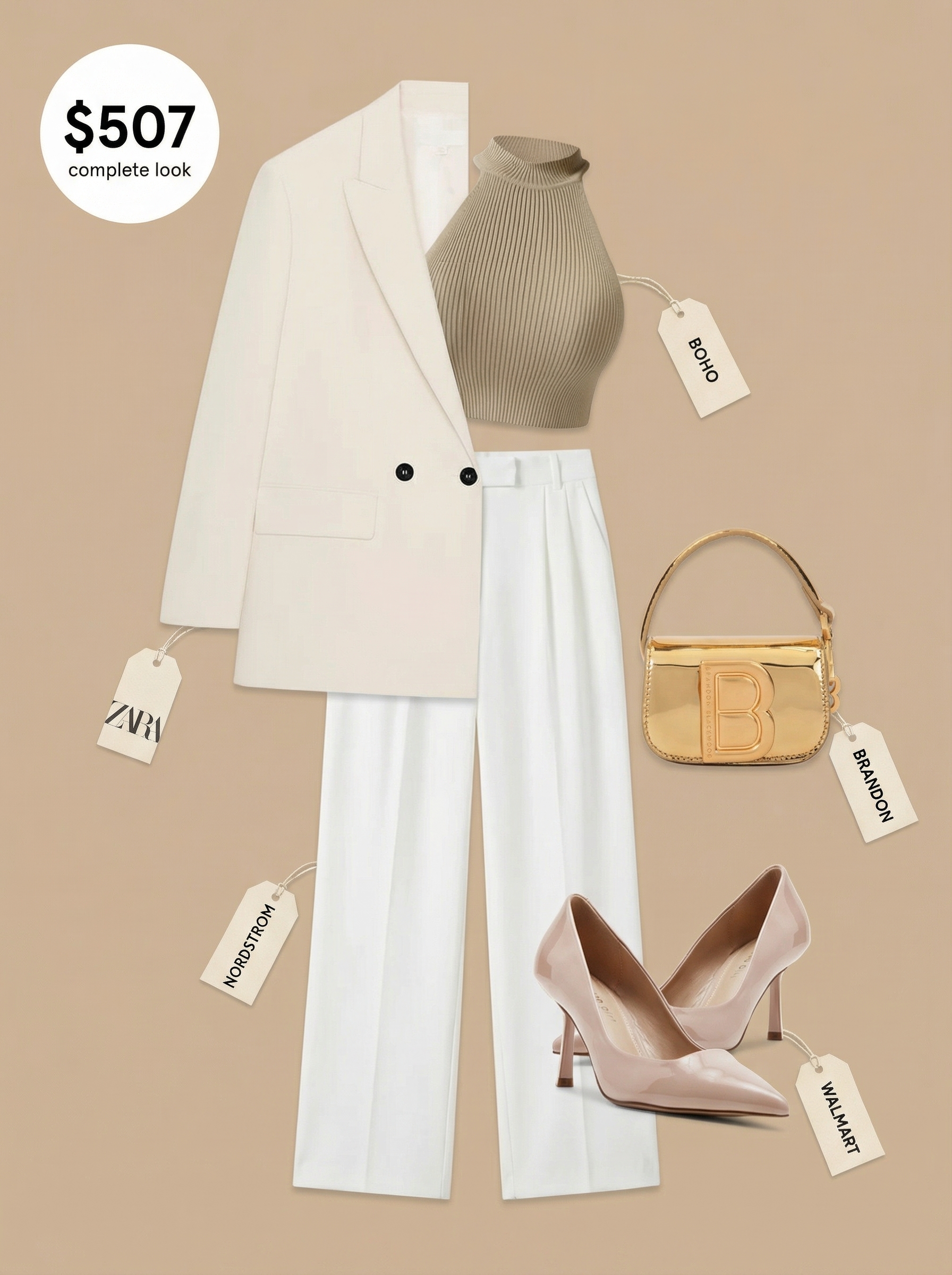The ultimate evening statement. This look, a true expression of a baddie’s summer style, features pristine white wide-leg polyester-blend pants for $218. The tailored cut of the pants (from Nordstrom!) creates an elongated, powerful line, ideal for projecting professionalism and chic confidence at a boss babe brunch. I paired them with an ivory oversized double-breasted crepe blazer, priced at $79.90, draped over the shoulders, which instantly elevates the whole outfit to an effortlessly chic statement.