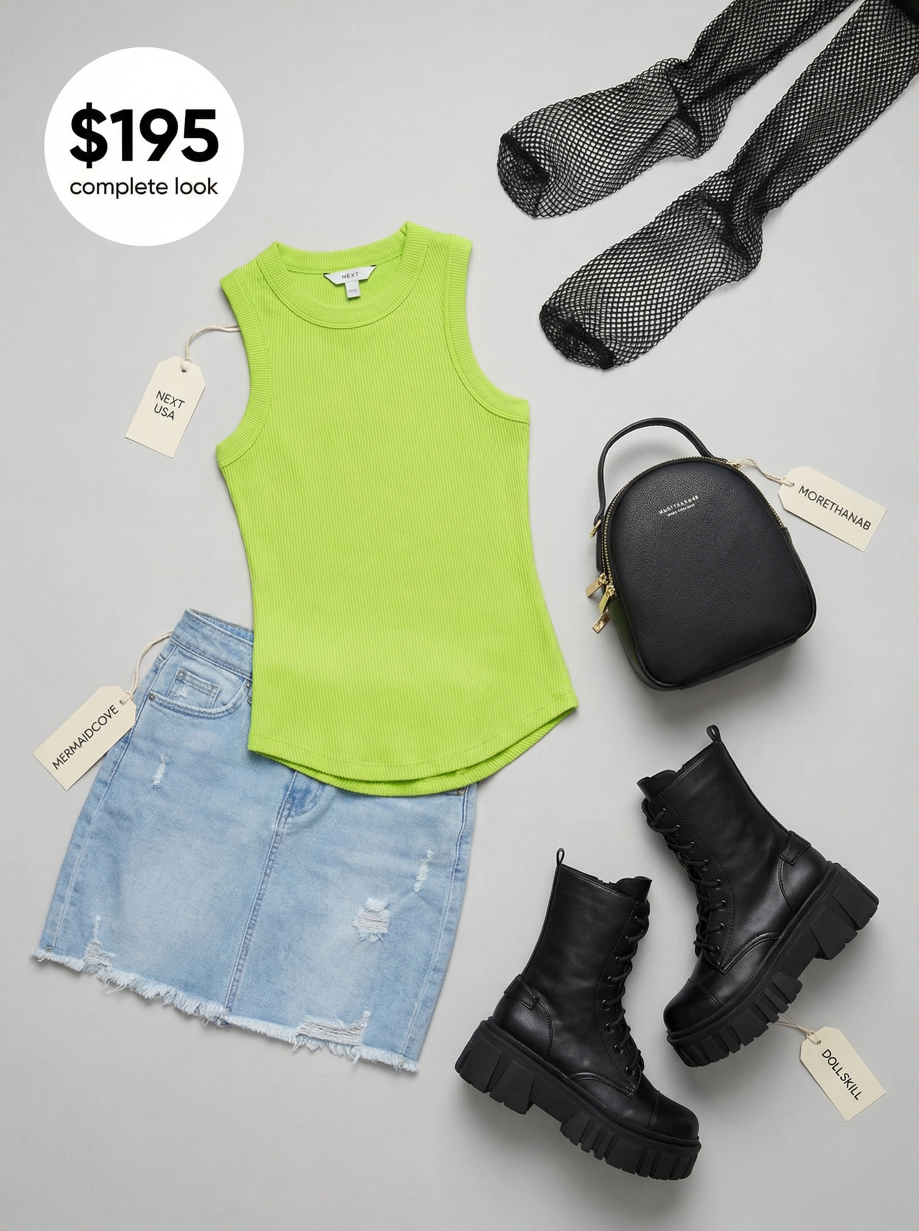 The perfect cut, indeed. This playful festival look kicks off with a vibrant neon green stretch cotton racerback top, $24, a truly eye-catching piece for baddie outfits in the summer. Paired with a light-wash denim mini skirt featuring a frayed hem, this skirt costs a mere $9.99. Its distressed details perfectly align with an edgy aesthetic. Lastly, for an extra layer of attitude and texture, I’ve added a pair of black nylon fishnet tights, a detail costing $13.50.