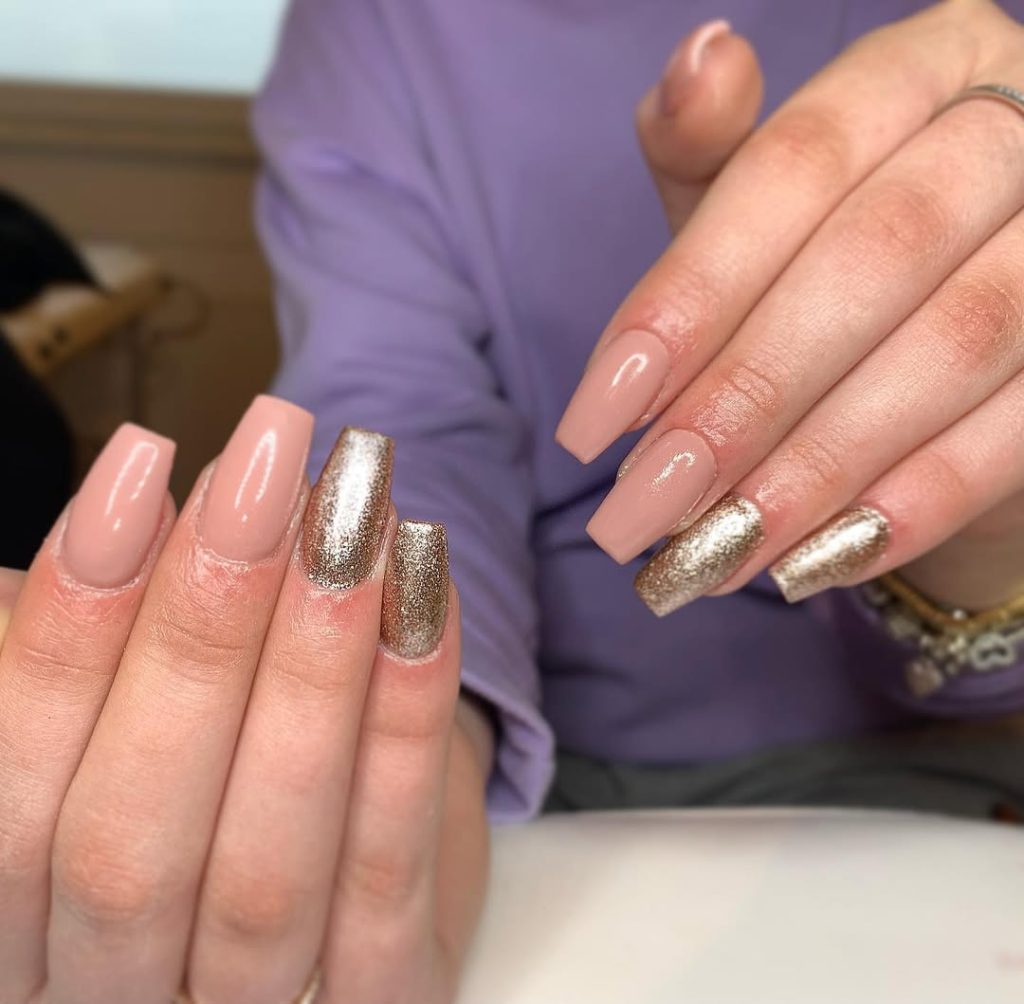 There’s something irresistibly elegant about this soft nude set paired with shimmering gold. It feels like the perfect blend of quiet luxury and a little festive sparkle—the kind of manicure that instantly makes you feel more polished, more intentional, and more feminine. The long ballerina shape adds just enough drama to keep things modern without crossing into anything too bold.