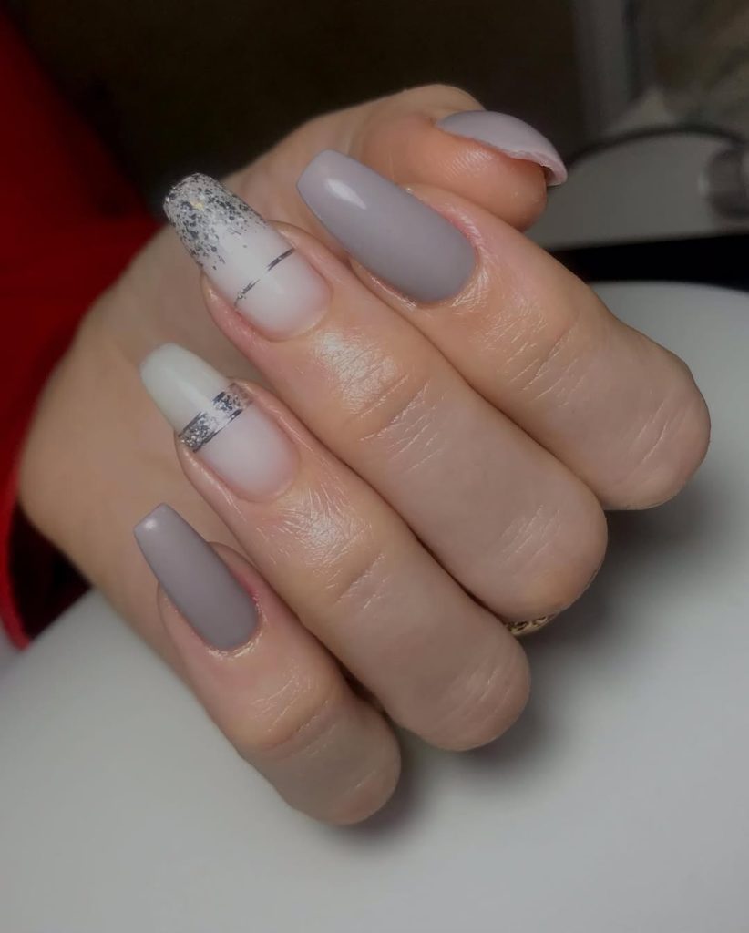 This calm, muted manicure feels soft and sophisticated—the mix of grey, milky white, and delicate silver dusting gives it a serene, almost winter-morning mood. It’s understated but never boring, with just enough shimmer to make the nails look polished and intentional.