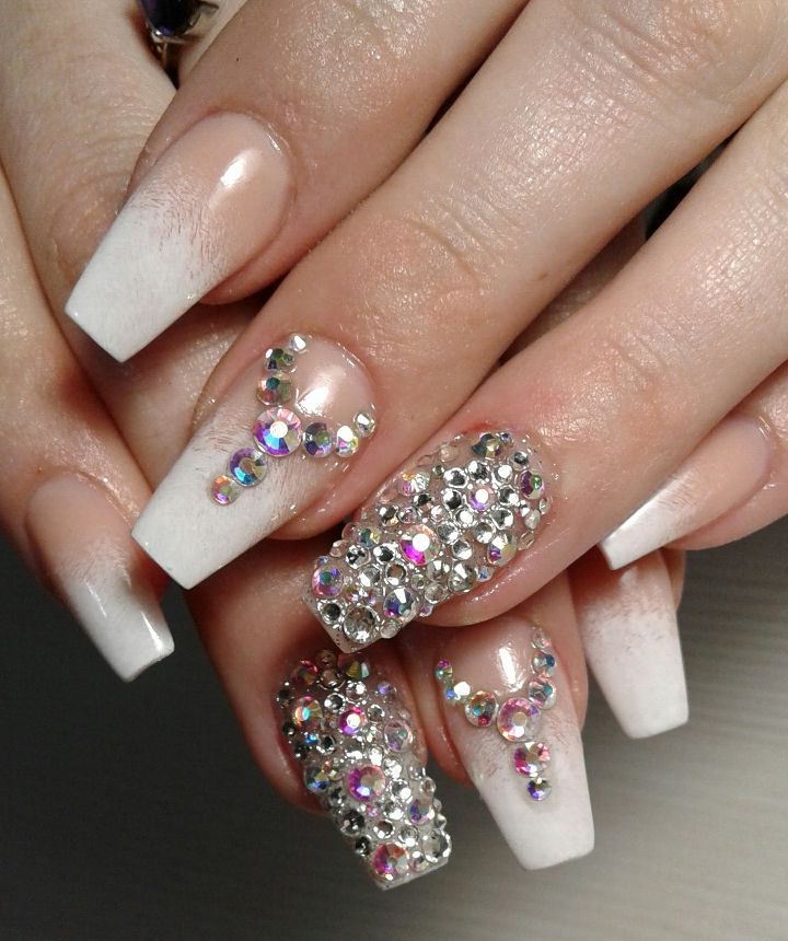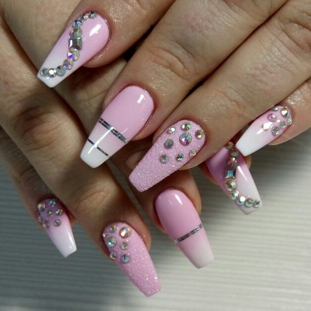 If you’re looking for low-maintenance glam, this design is ideal. The simple structure means the manicure stays neat longer, while the crystals bring design ideas classy enough for dinners, events, or even everyday chic. The ballerina shape ties everything together with a timeless finish.