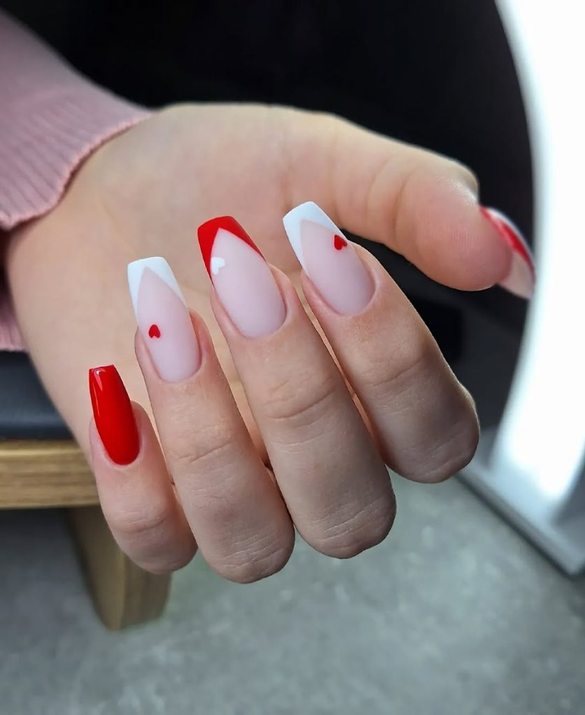 This charming mix of red, white, and soft nude creates a playful yet romantic vibe. The tiny hearts add just the right hint of sweetness, while the bold red nails bring energy and confidence. It’s flirty, fun, and full of personality—a perfect way to brighten your mood.