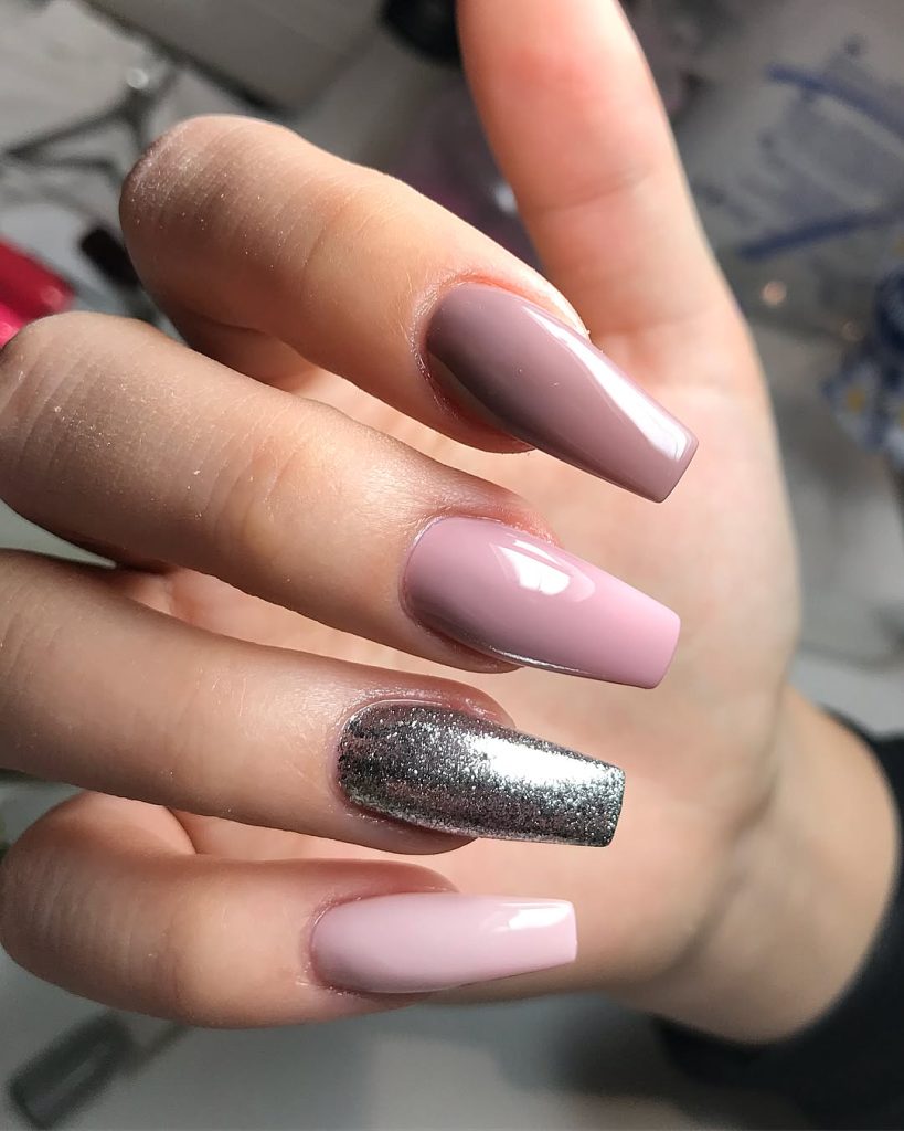 This pink-and-silver manicure feels elegant and polished—the mix of cool-tone pinks and a striking metallic accent gives it a chic, modern glow. It’s simple yet eye-catching, with just enough shimmer to make it feel extra without being dramatic.
