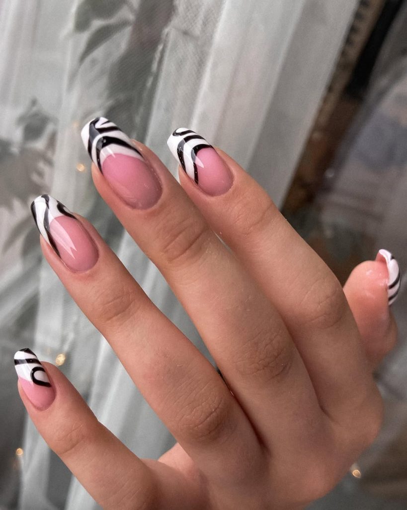 The combination of soft pink and bold black-and-white swirls really makes this manicure modern and artistic. This is because there is a stark contrast of colors, which is also elegant. The swirls formed elongated lines that provide a sense of movement and flow. This also enriches the sense of mystery in the design, making the nails feel as if there is abstract art captured on the tips.