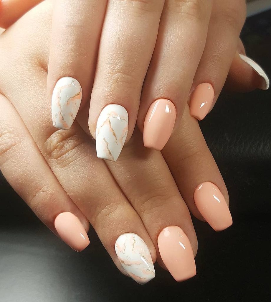 This peach-and-white manicure feels calm, gentle, and incredibly feminine. The marble accents add a luxurious touch, almost like soft stone veining, giving the nails a serene and sophisticated energy. It’s a warm, flattering look that instantly brightens the hands.