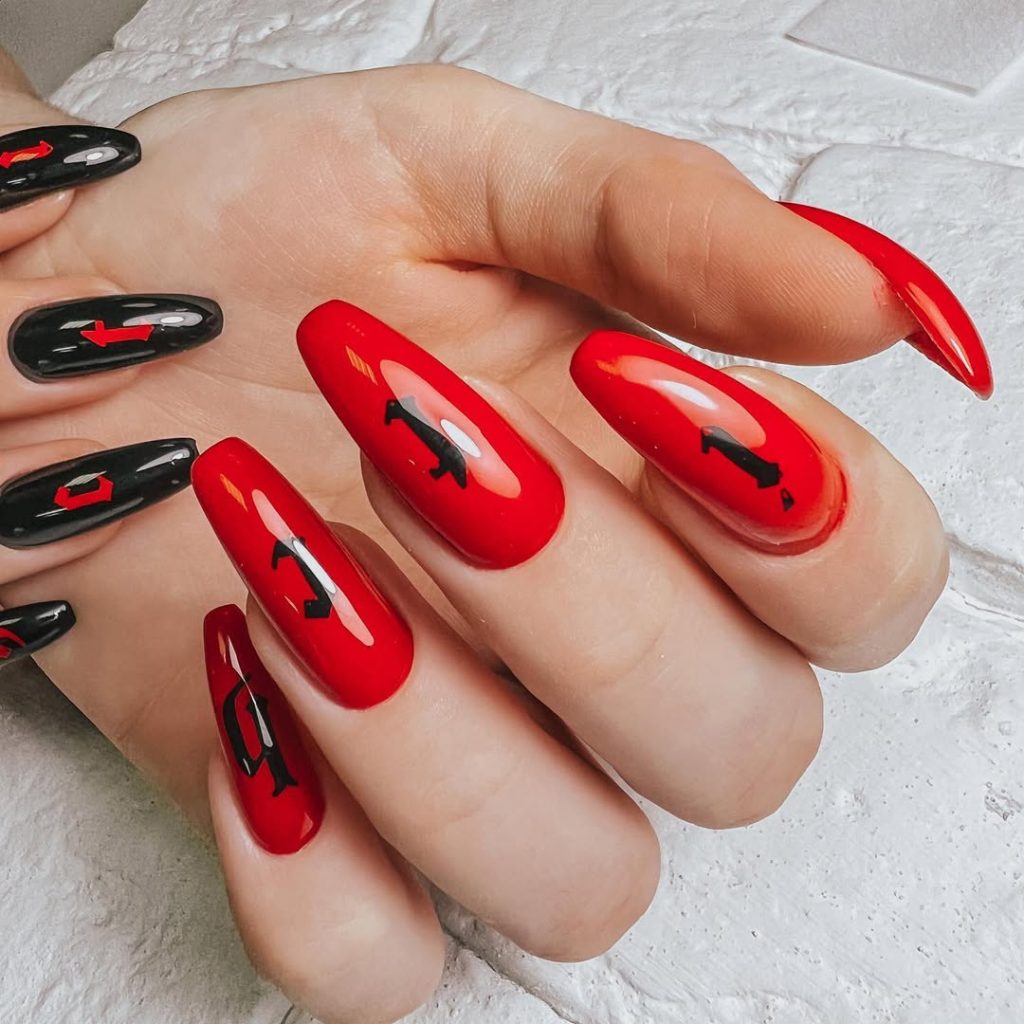 This striking red-and-black combination radiates confidence—bold, fiery, and impossible to ignore. The glossy finish intensifies the color, while the minimal black graphics add a trendy, fashion-driven feel. It’s a fierce, powerful manicure that makes a statement instantly.