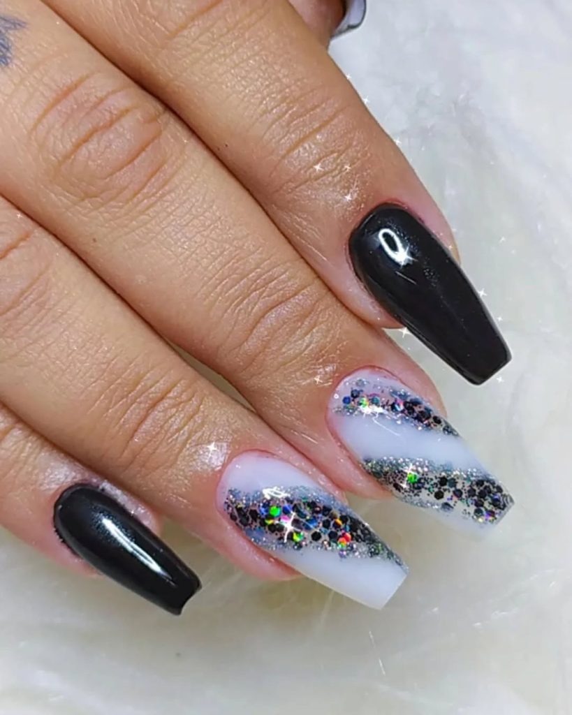 This bold mix of deep black and shimmering silver instantly gives off a confident, slightly edgy vibe. The glitter diagonal accents bring movement to the look, almost like evening lights reflecting on smooth glass. It’s dramatic, stylish, and perfect for anyone who loves a manicure that stands out without shouting.