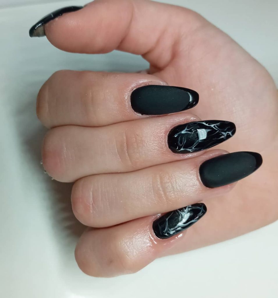 This deep matte black manicure feels bold and mysterious, with just a touch of softness from the marble details. The contrast between matte and glossy art gives it depth and sophistication, creating a chic, moody look that draws attention instantly.