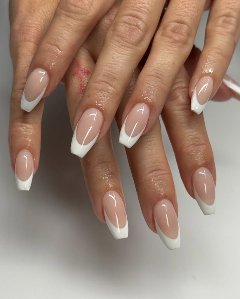 This updated French manicure brings a crisp, modern edge to a timeless look. The white tips curve softly, creating a fresh and refined finish that feels clean and elegant. It’s the kind of manicure that instantly makes the hands look graceful and well-kept.