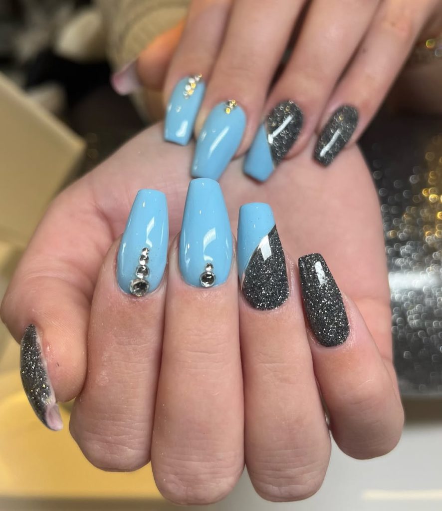 This soft blue set feels refreshing—like a breath of cool air on a busy day. The color is playful but still grown-up, and the added sparkle brings just the right amount of personality. The mix of glossy blue and dark glitter nails creates a chic contrast that feels fun without losing its polish.