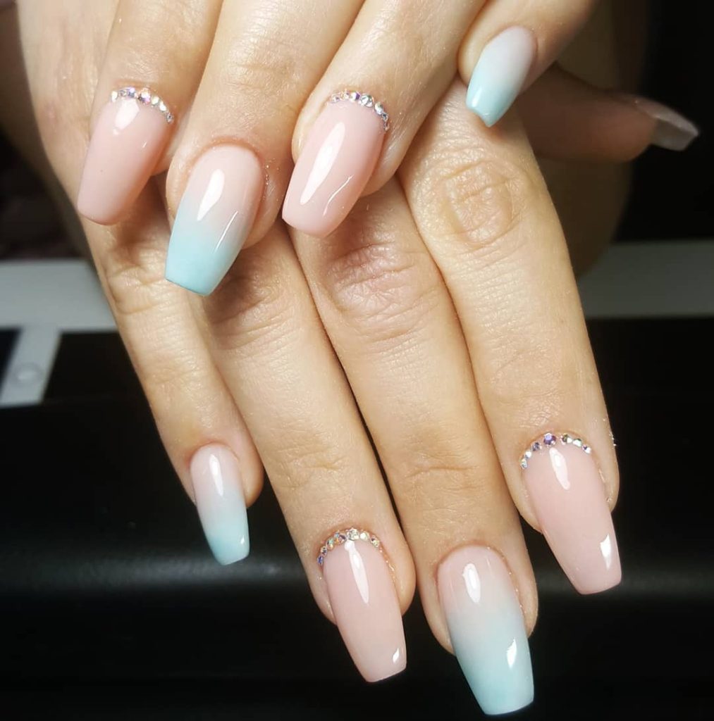 This soft pink-to-aqua ombré feels dreamy and delicate—almost like a watercolor wash across the nails. It’s gentle, romantic, and perfect for moments when you want something beautiful but not overpowering. The tiny crystals add a graceful sparkle that elevates the entire look without stealing the spotlight.