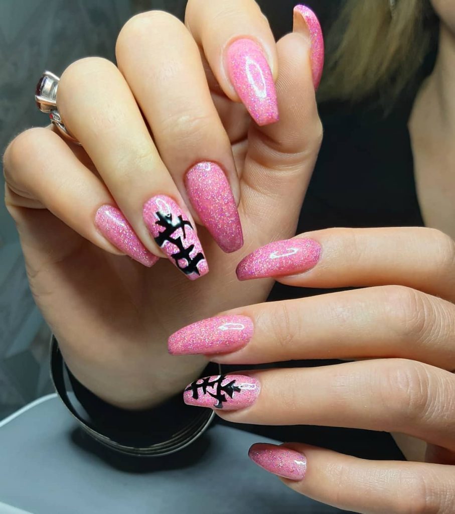 These bright pink glitter nails instantly lift the mood—they feel playful, youthful, and full of personality. The soft sparkle catches the light beautifully, while the bold black branch-like detail adds an unexpected edge. It’s the kind of design that makes you smile every time you glance at your hands.