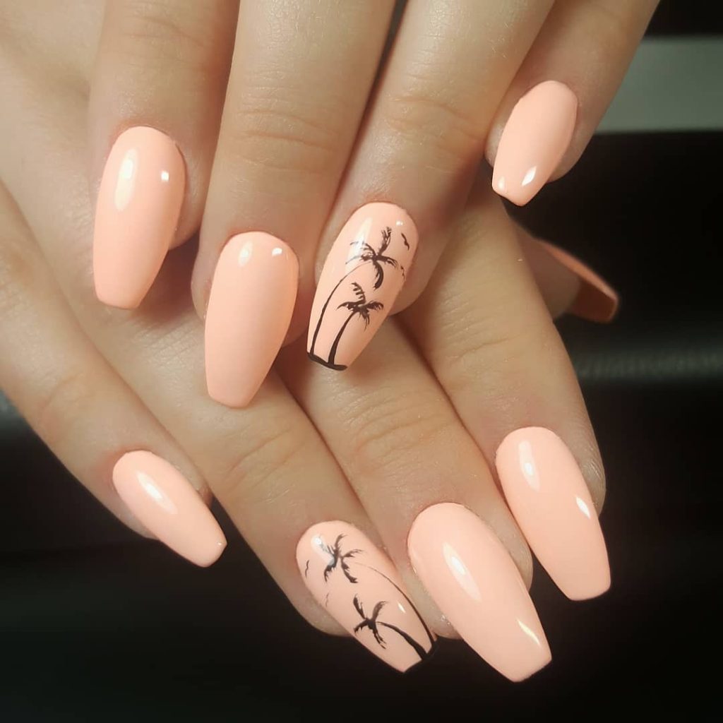 There’s something incredibly calming about this peach-toned manicure—it feels like warm sand and soft sunlight wrapped into a nail design. The delicate palm tree accents bring a breezy vacation vibe, making the whole look feel relaxed and effortlessly stylish. It’s gentle, feminine, and wonderfully uplifting.