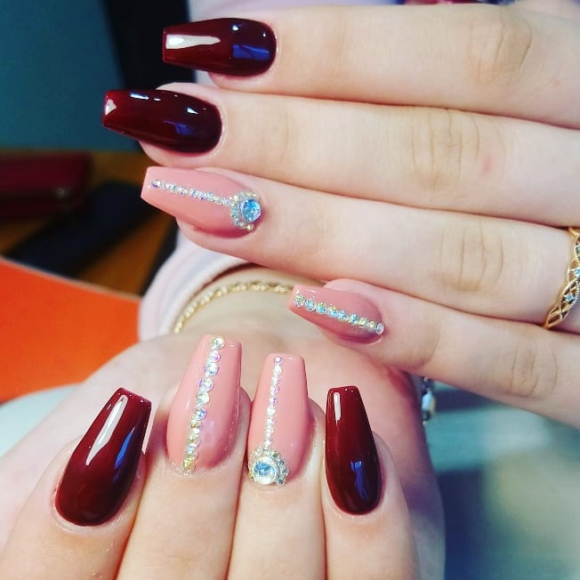 This mix of deep burgundy and soft nude creates a rich, elegant contrast that instantly feels luxurious. The crystal lines add a touch of glam without taking away from the classic color pairing. It’s polished, sophisticated, and perfect for moments when you want your nails to feel like jewelry.