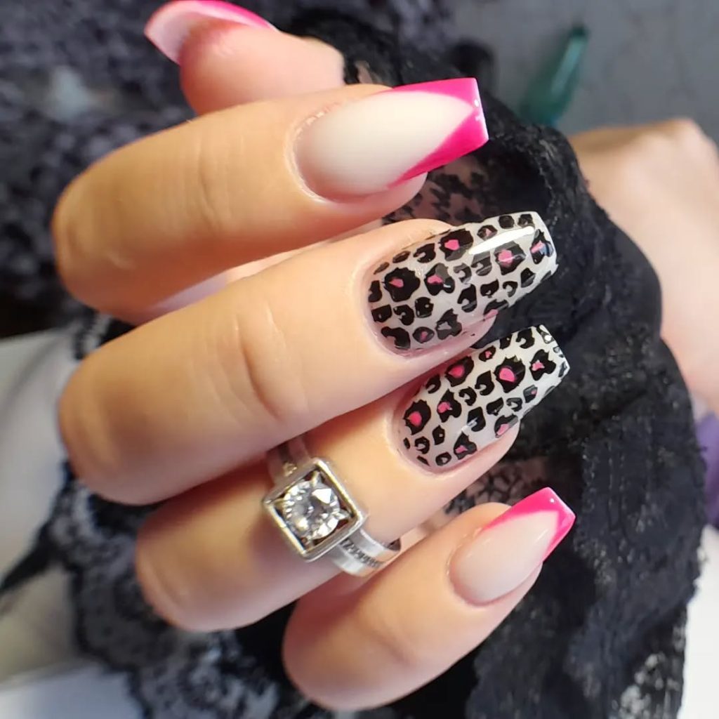 This manicure brings together the perfect mix of wild and feminine—soft neutral tones paired with hot pink French tips and playful leopard print. It’s fun, fearless, and full of personality, making it a great choice for anyone wanting a look that stands out in the best way.