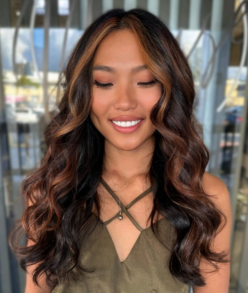 This hairstyle is especially flattering for asian women with naturally dark hair who want brightness without going full blonde. The face-framing strands slim and elongate features, while the long wavy texture keeps it soft and romantic. A curling wand or large rollers will help recreate these waves, and a touch of glossing serum enhances the caramel dimension beautifully.