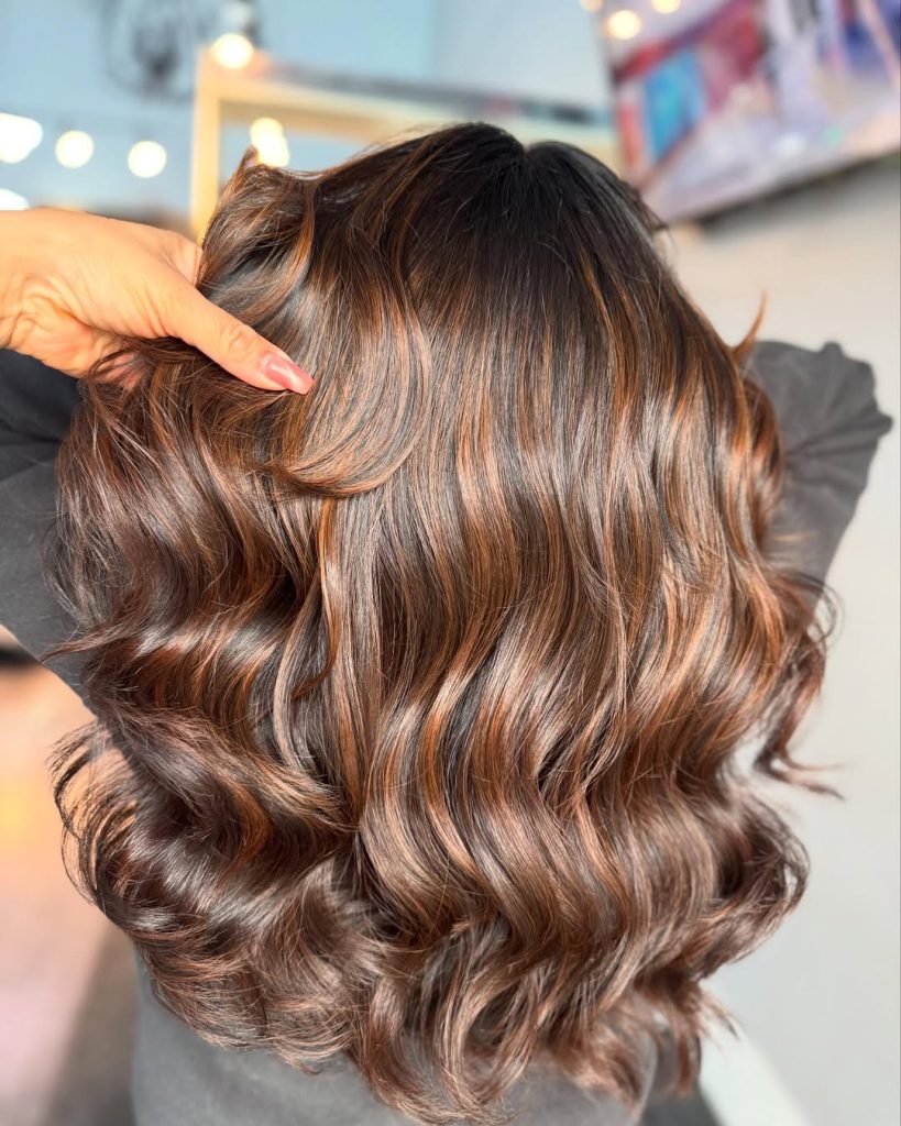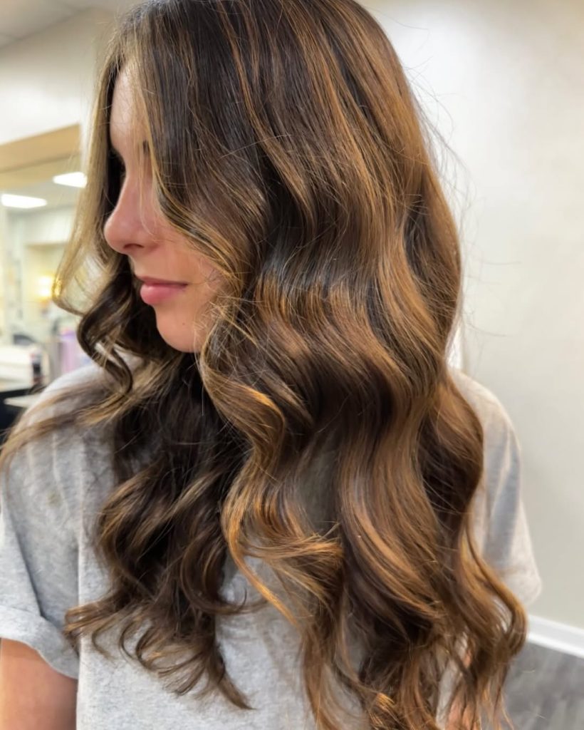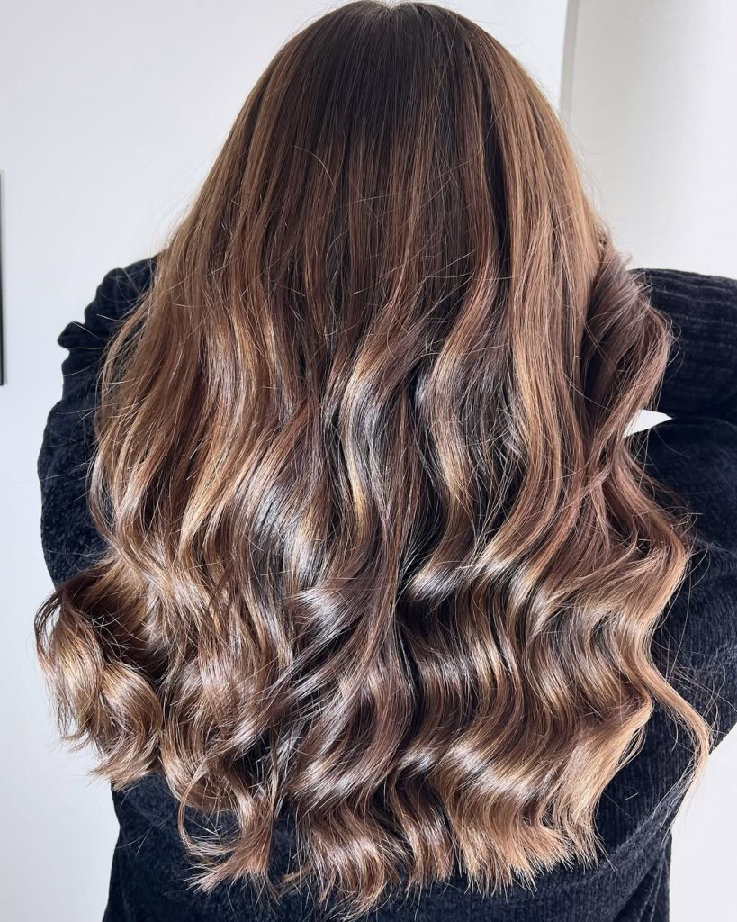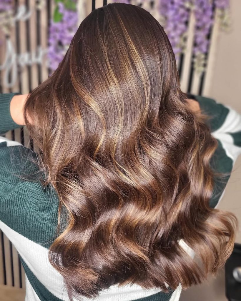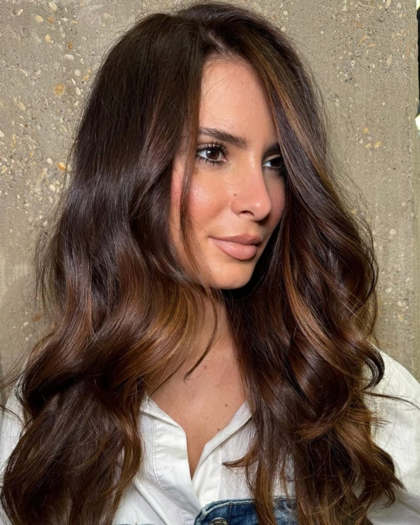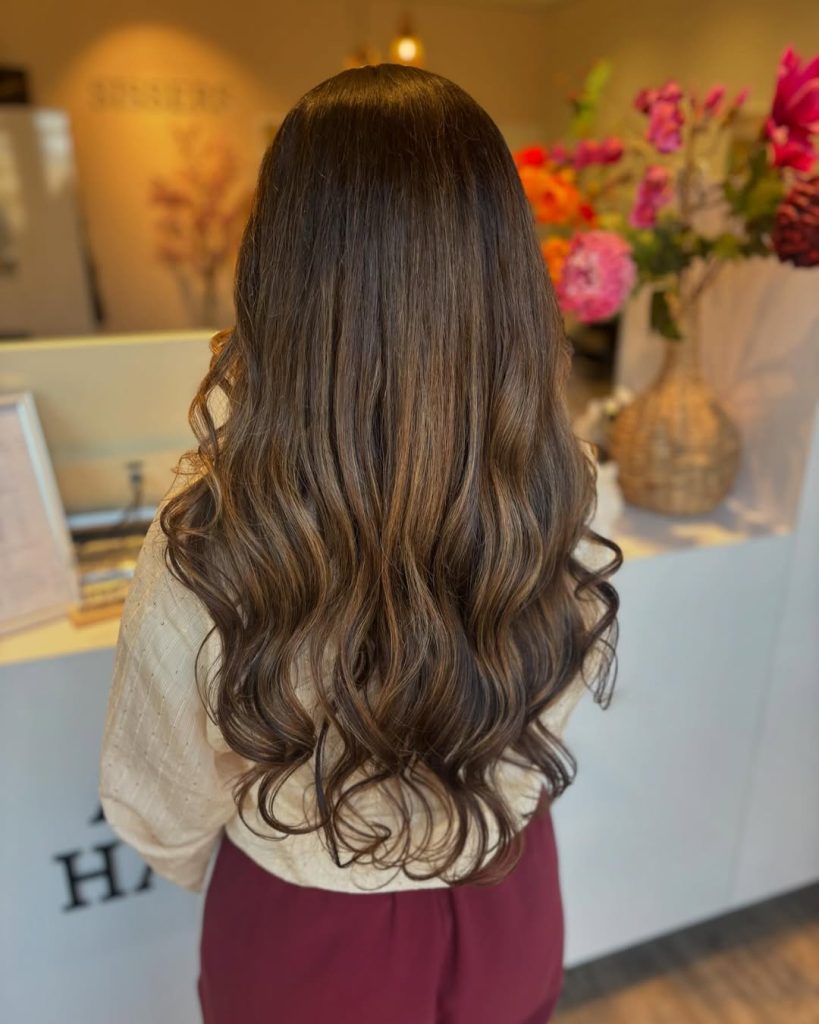 This look combines the richness of medium brown hair with soft caramel highlights that catch the light beautifully. The subtle layering adds movement, while the long waves keep the style flowing and elegant. It’s a timeless, flattering choice that feels natural but elevated.