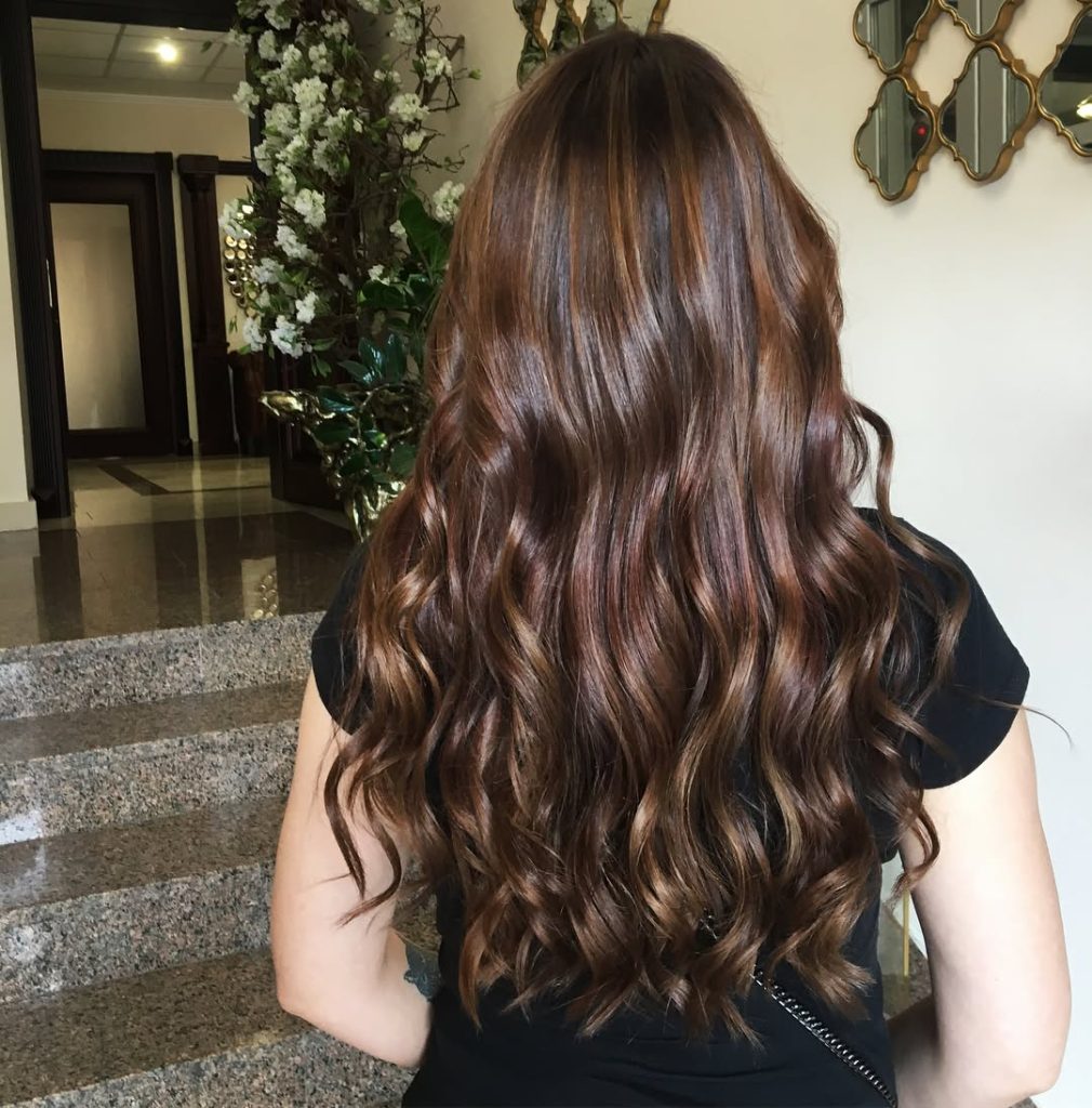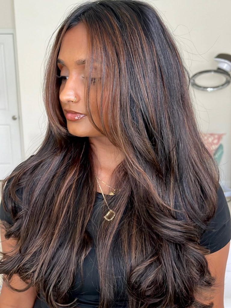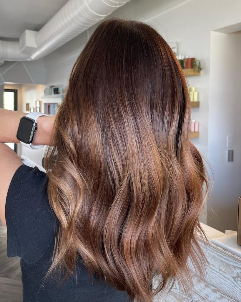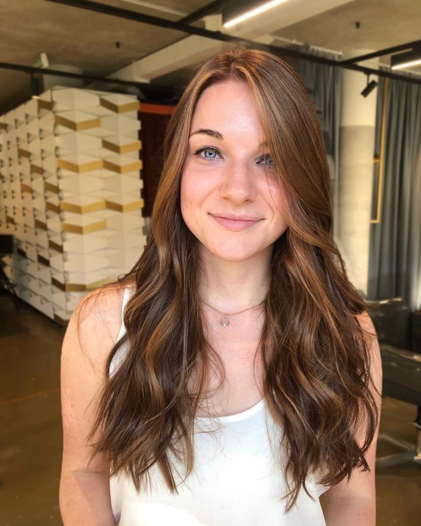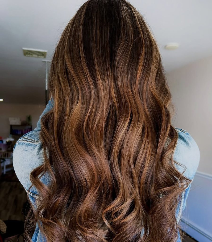 This look combines the richness of medium brown hair with soft caramel highlights that catch the light beautifully. The subtle layering adds movement, while the long waves keep the style flowing and elegant. It’s a timeless, flattering choice that feels natural but elevated.